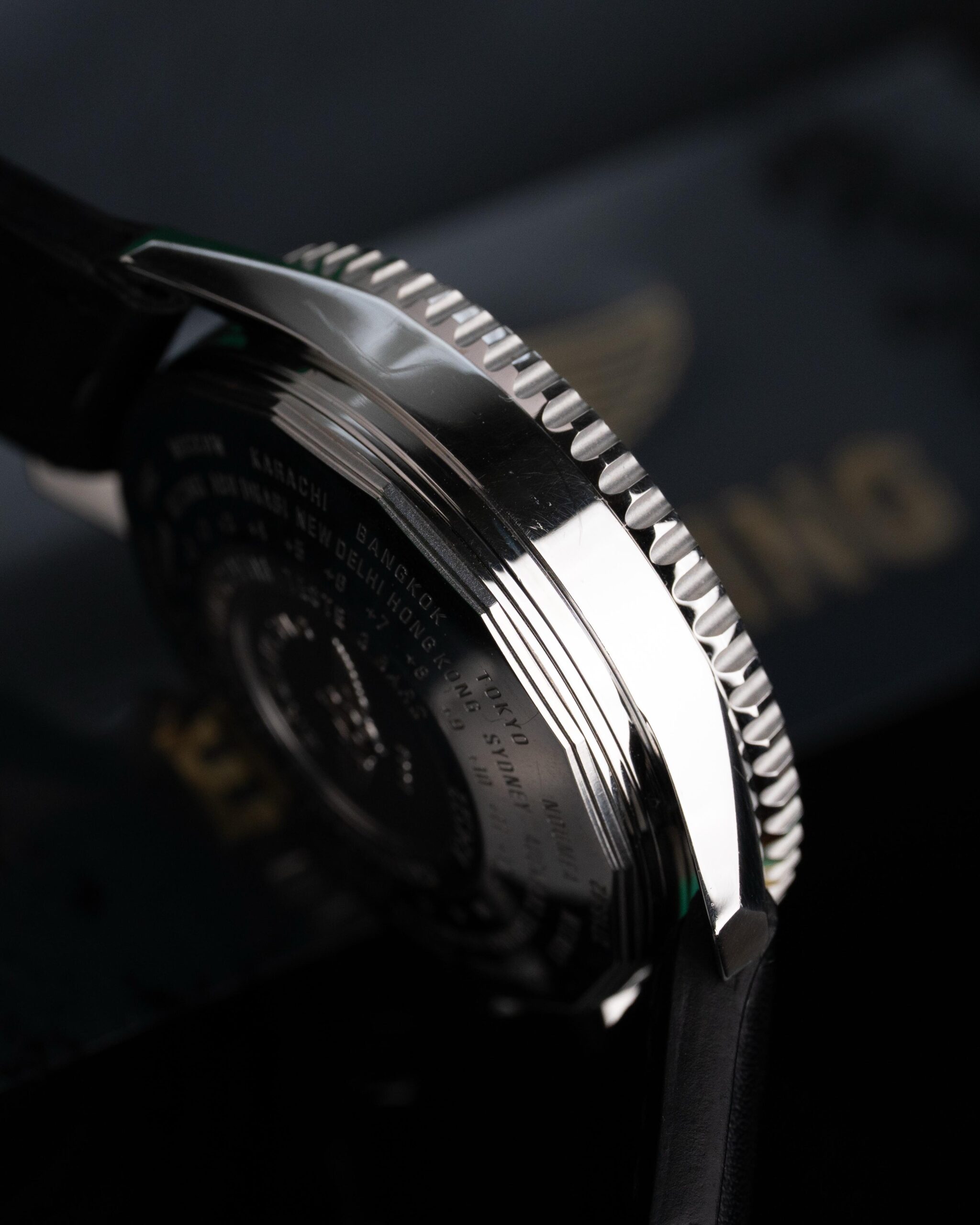 Model A24322 wyposażony jest w czytelną, głęboką czarną tarczę z kontrastowymi totalizatorami chronografu oraz centralną, czerwoną wskazówką GMT odpowiedzialną za drugą strefę czasową. Luminescencyjne indeksy i wskazówki zapewniają znakomitą widoczność, a całość chroni wytrzymałe szafirowe szkło z powłoką antyrefleksyjną.
