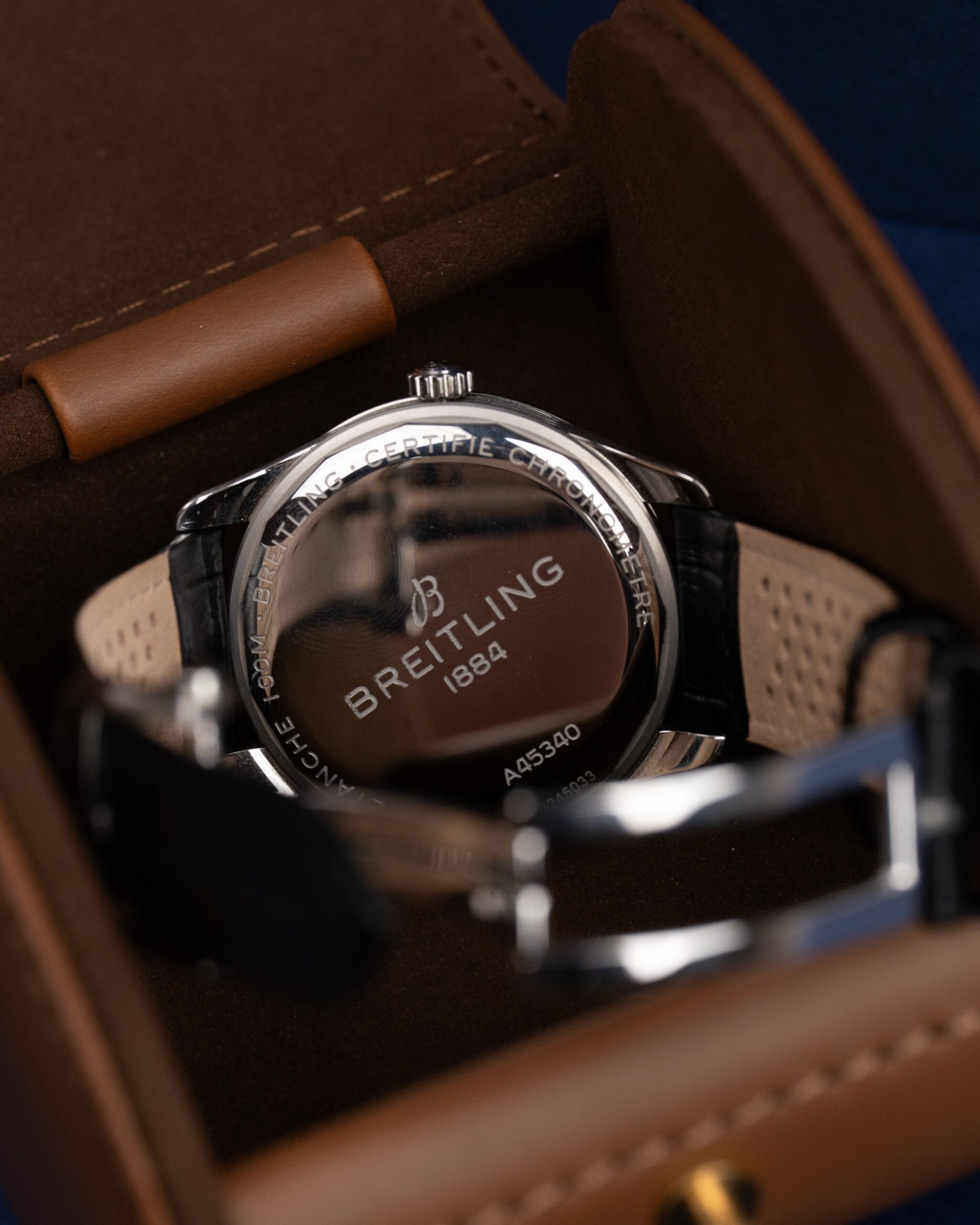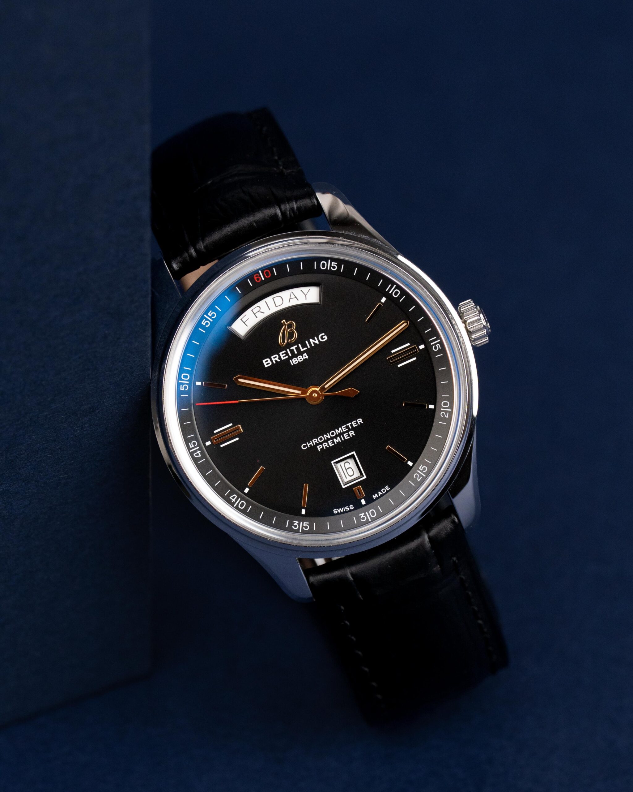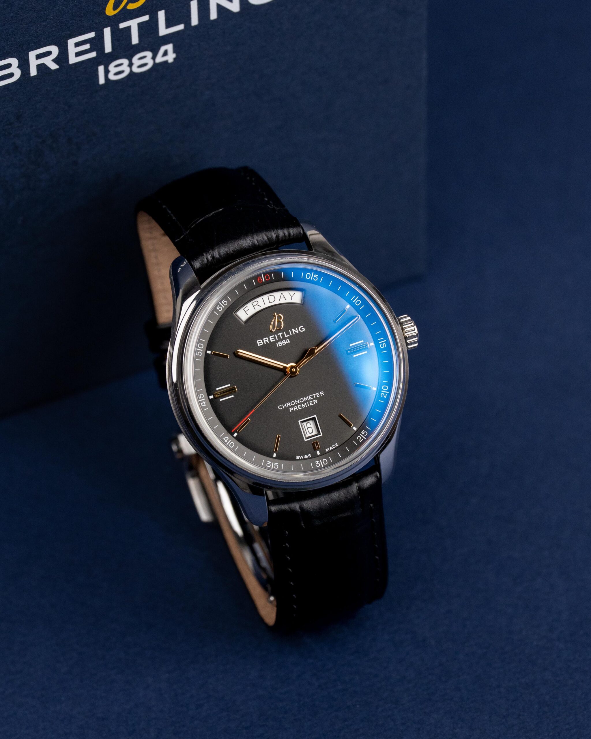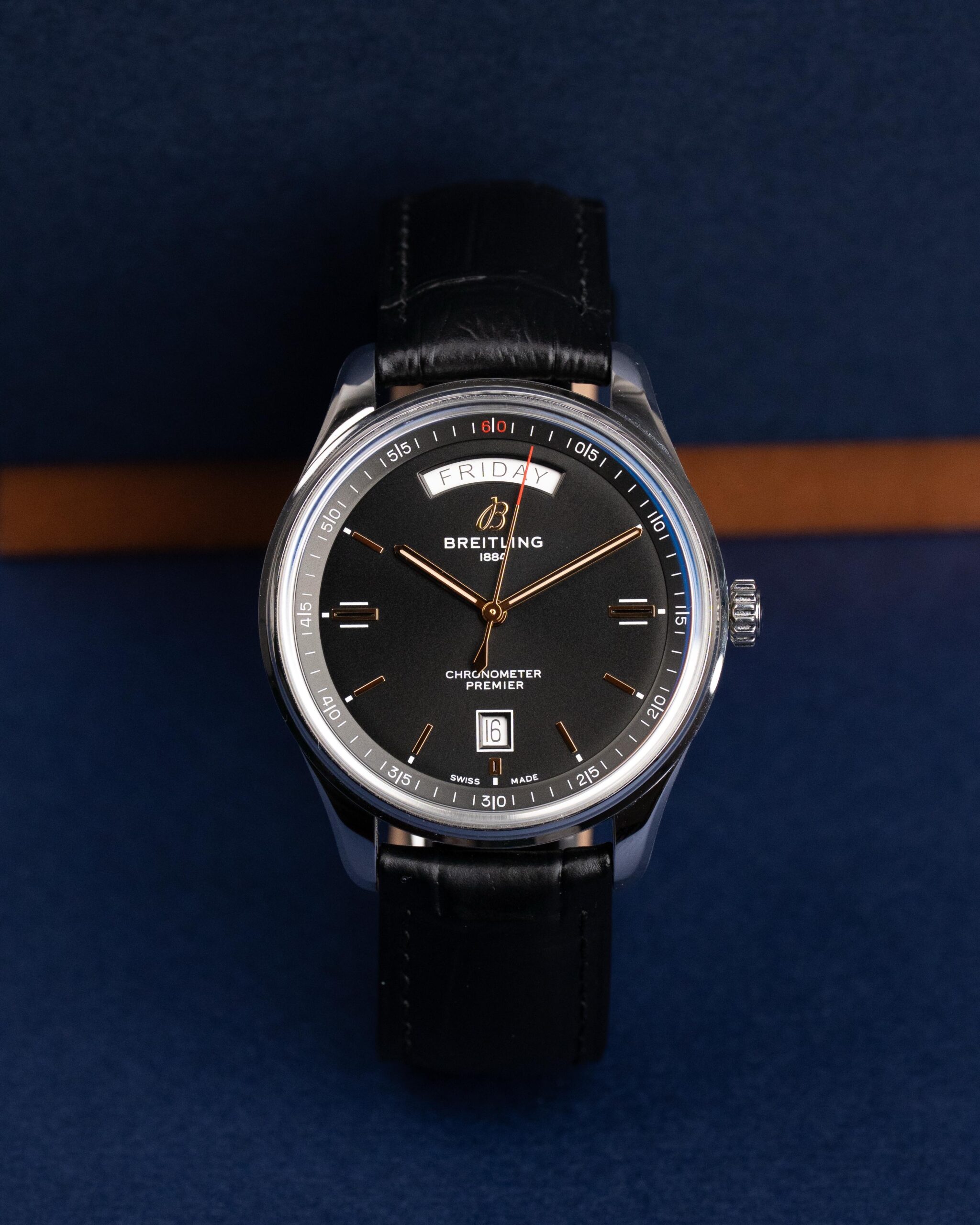 Breitling Premier ref. A45340 z czarną tarczą to klasyczny zegarek o eleganckim, ponadczasowym charakterze, wzbogacony o praktyczną funkcję dnia tygodnia i daty. Stonowana stylistyka sprawia, że model ten doskonale sprawdzi się zarówno w formalnych, jak i codziennych zestawieniach.