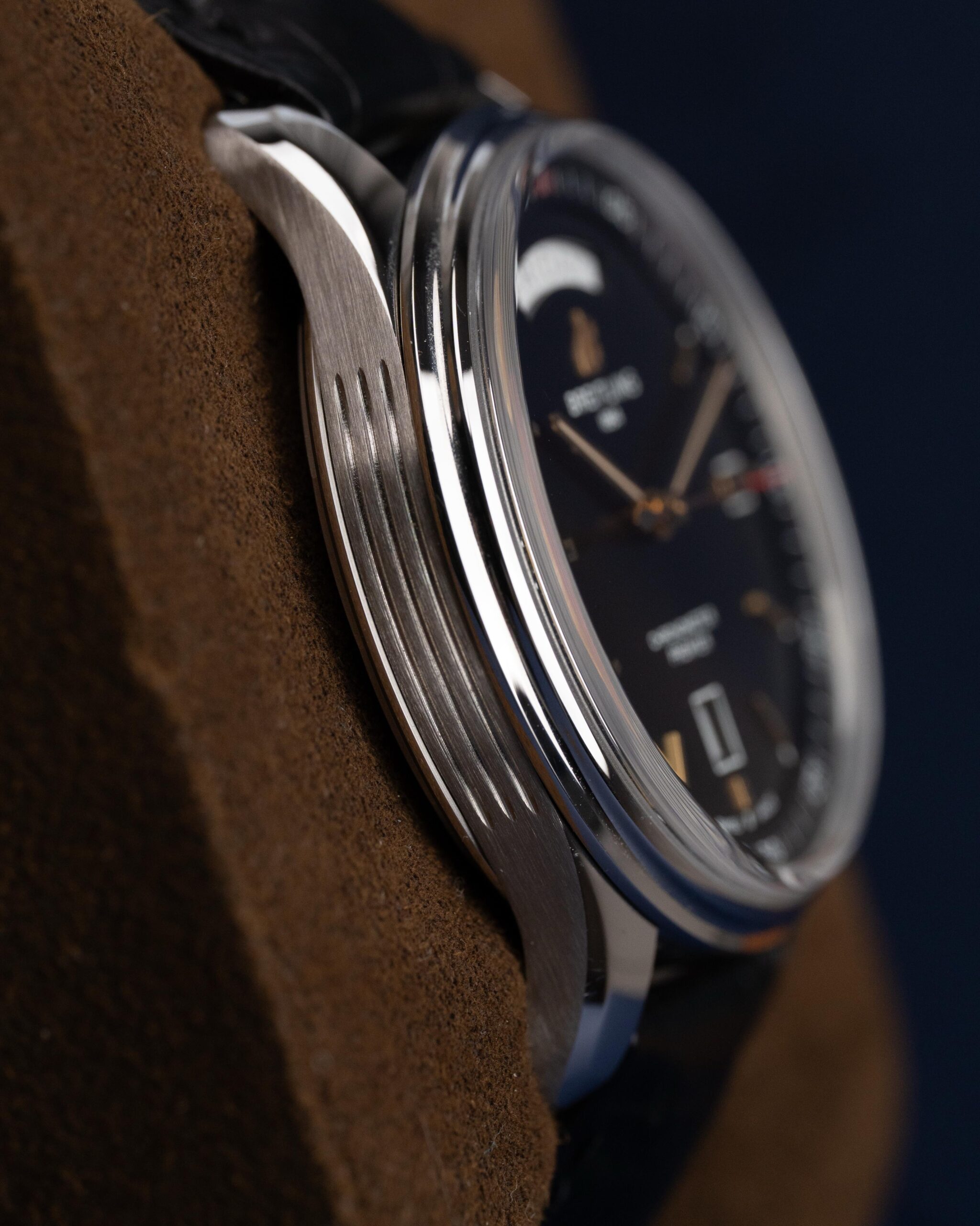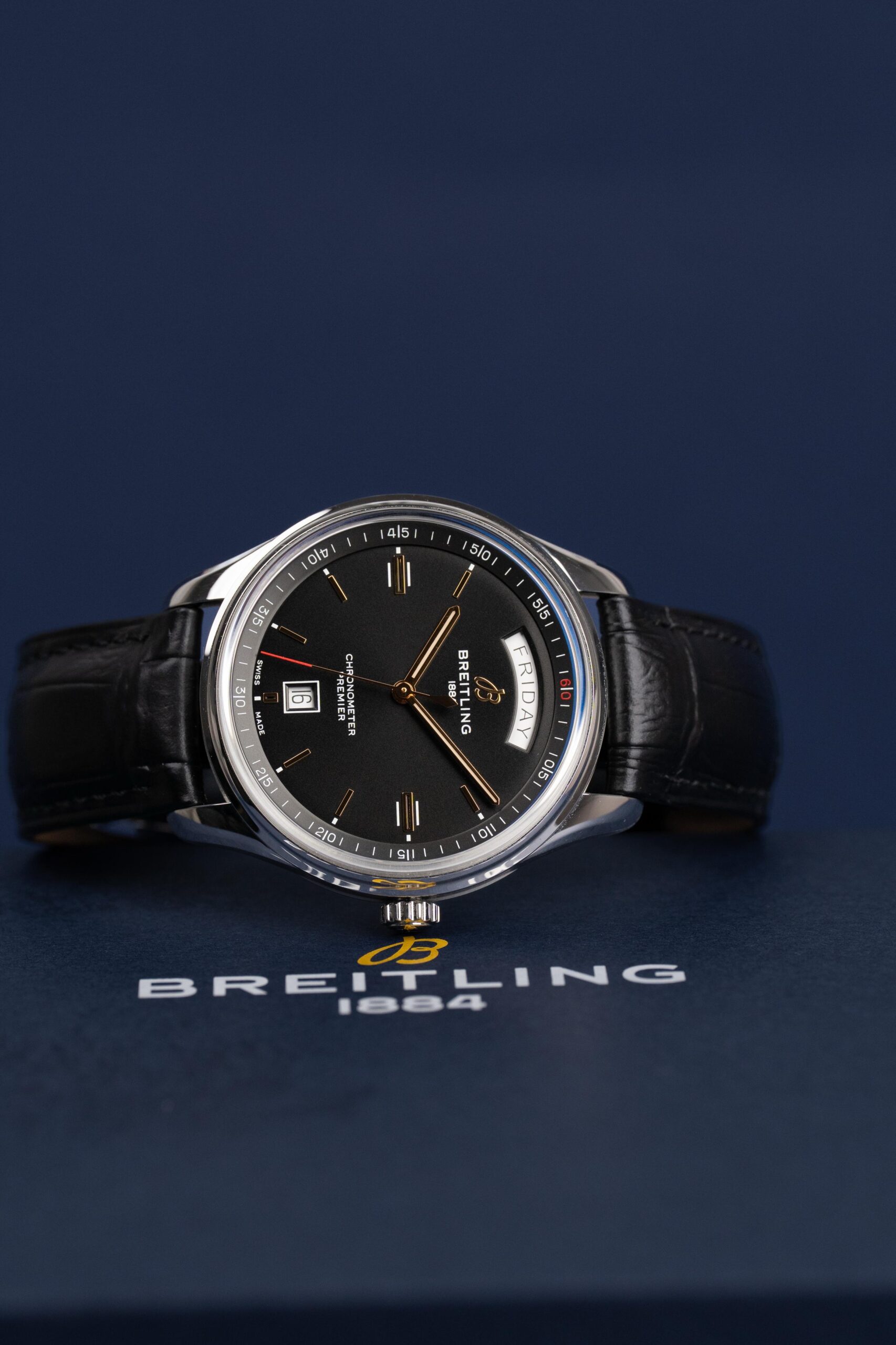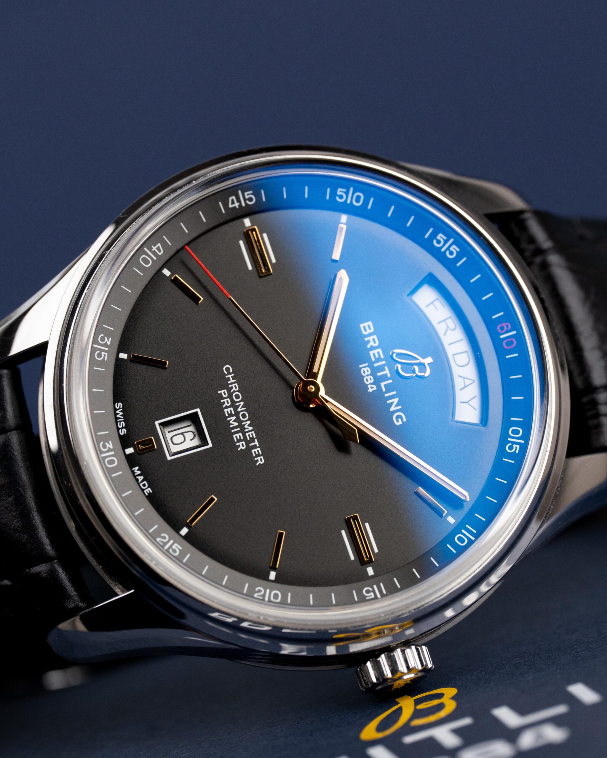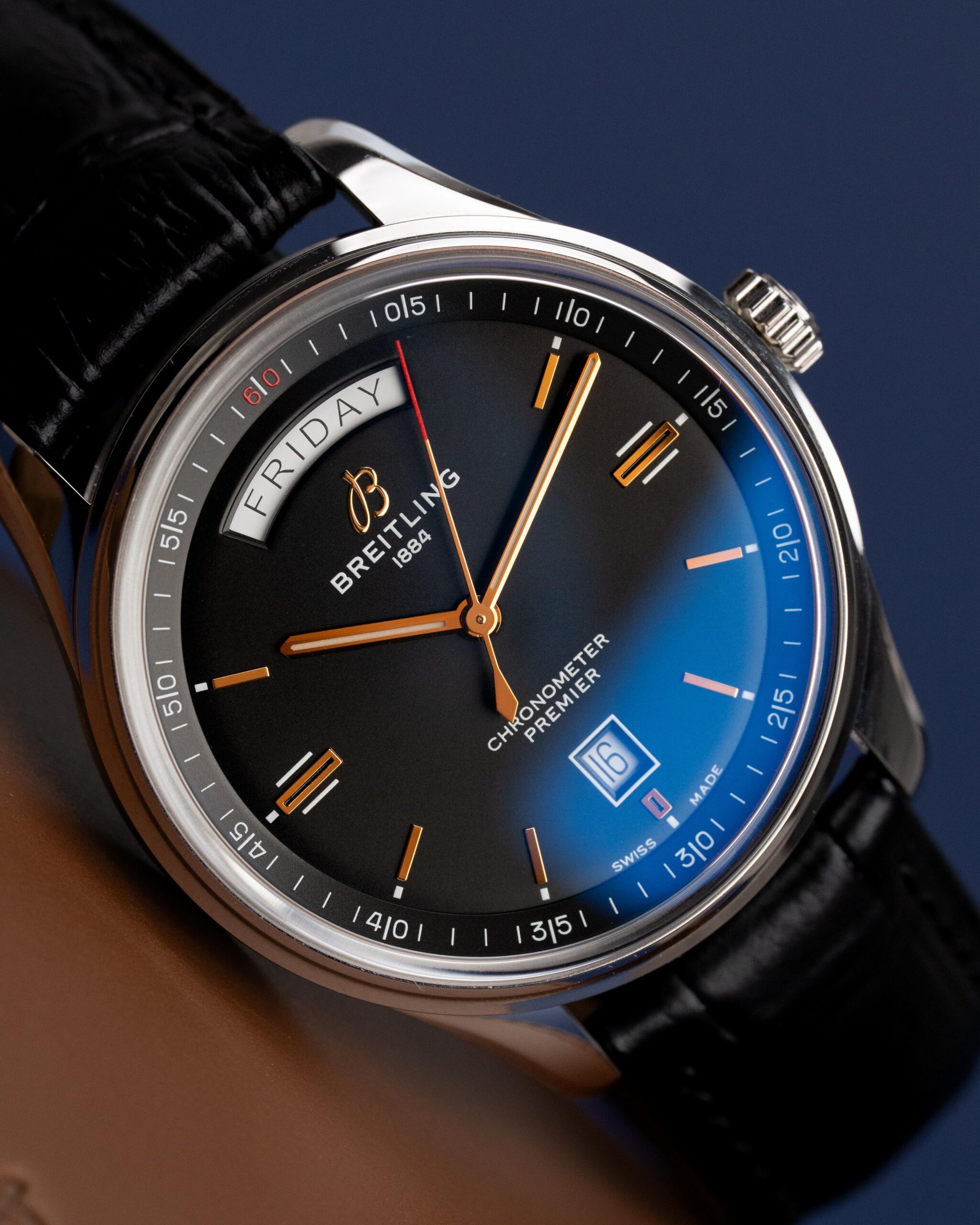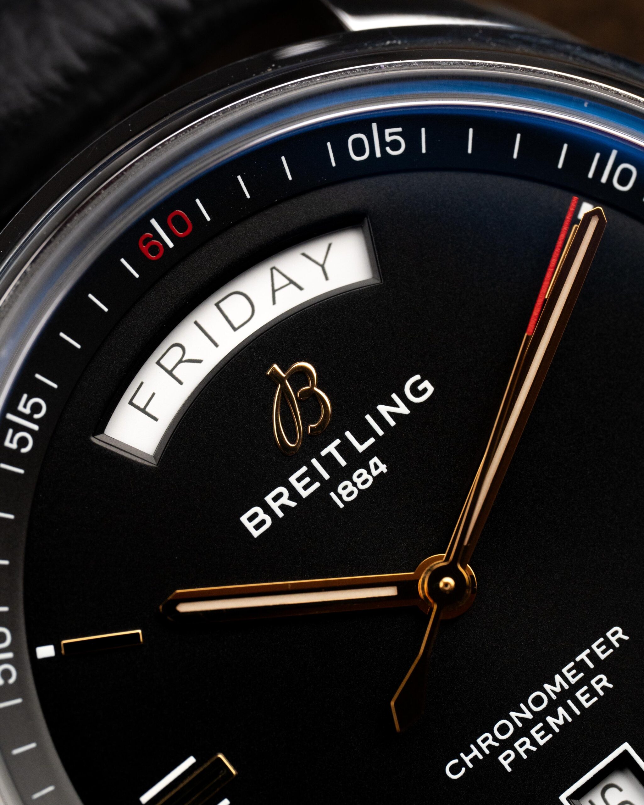 Breitling Premier ref. A45340 z czarną tarczą to klasyczny zegarek o eleganckim, ponadczasowym charakterze, wzbogacony o praktyczną funkcję dnia tygodnia i daty. Stonowana stylistyka sprawia, że model ten doskonale sprawdzi się zarówno w formalnych, jak i codziennych zestawieniach.
