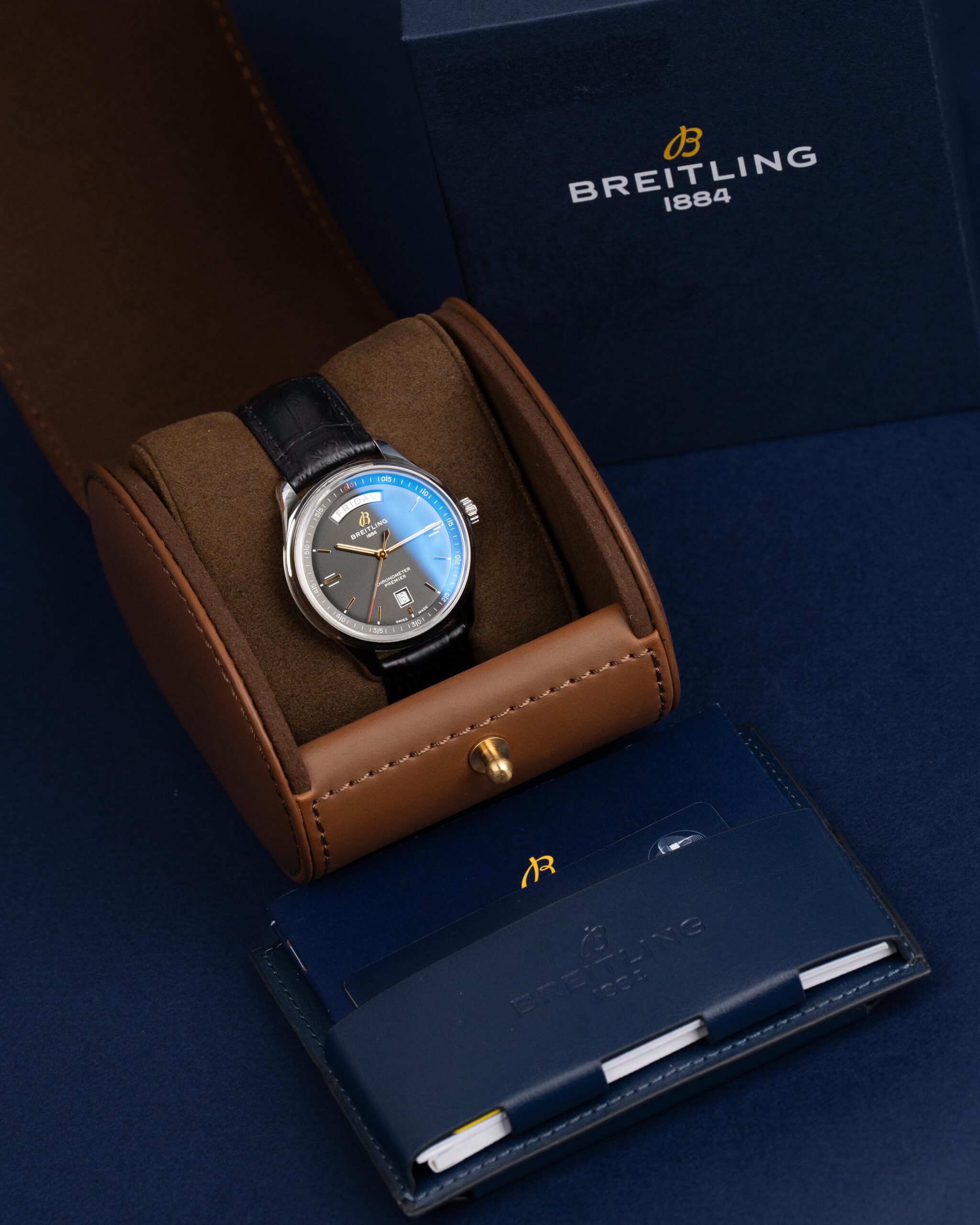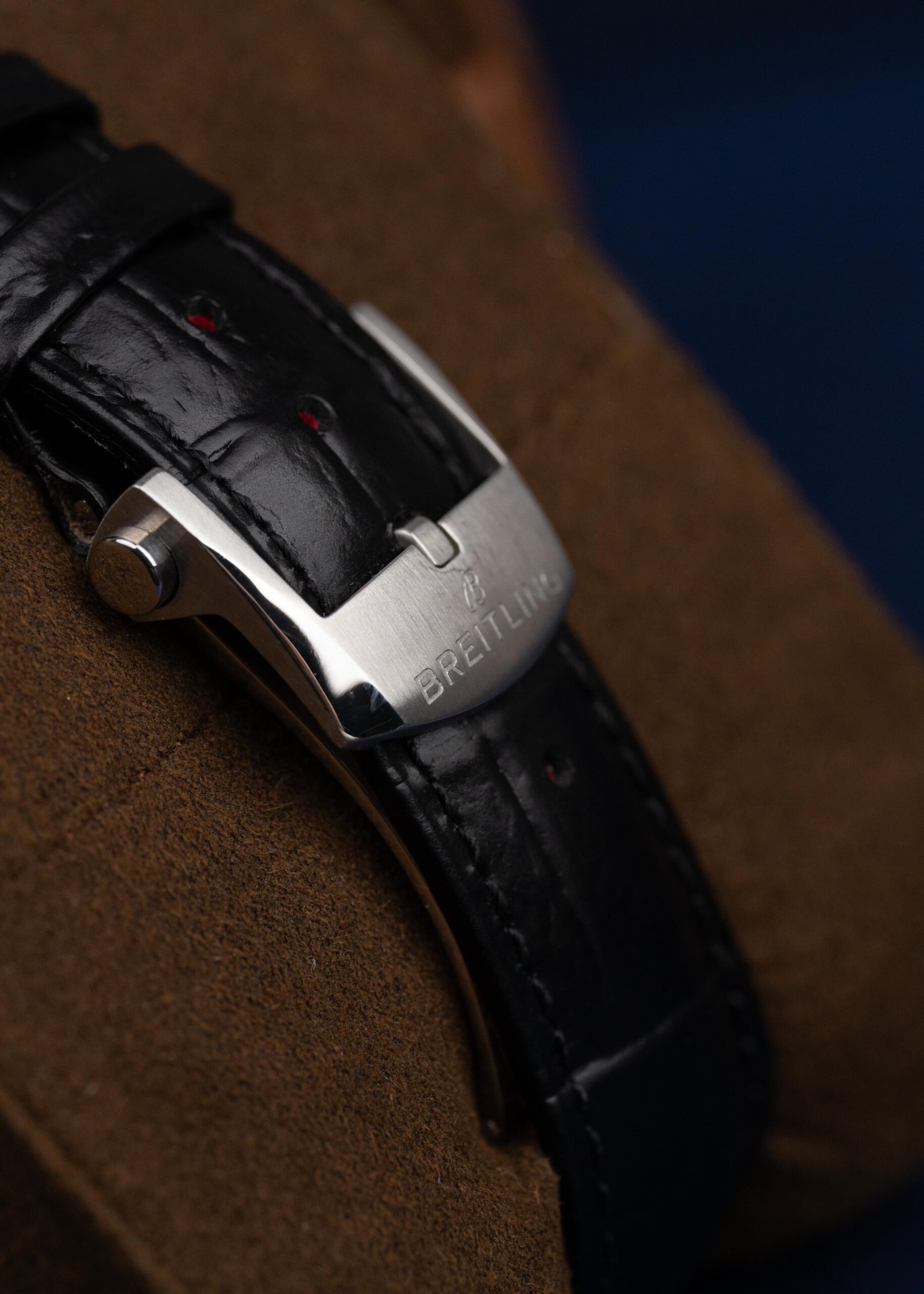 Zegarek napędzany jest automatycznym mechanizmem Breitling, cenionym za niezawodność i stabilną pracę. Stalowa koperta o średnicy 40 mm harmonijnie współgra z czarną, czytelną tarczą, na której klasyczne indeksy i wskazówki zapewniają doskonałą czytelność.