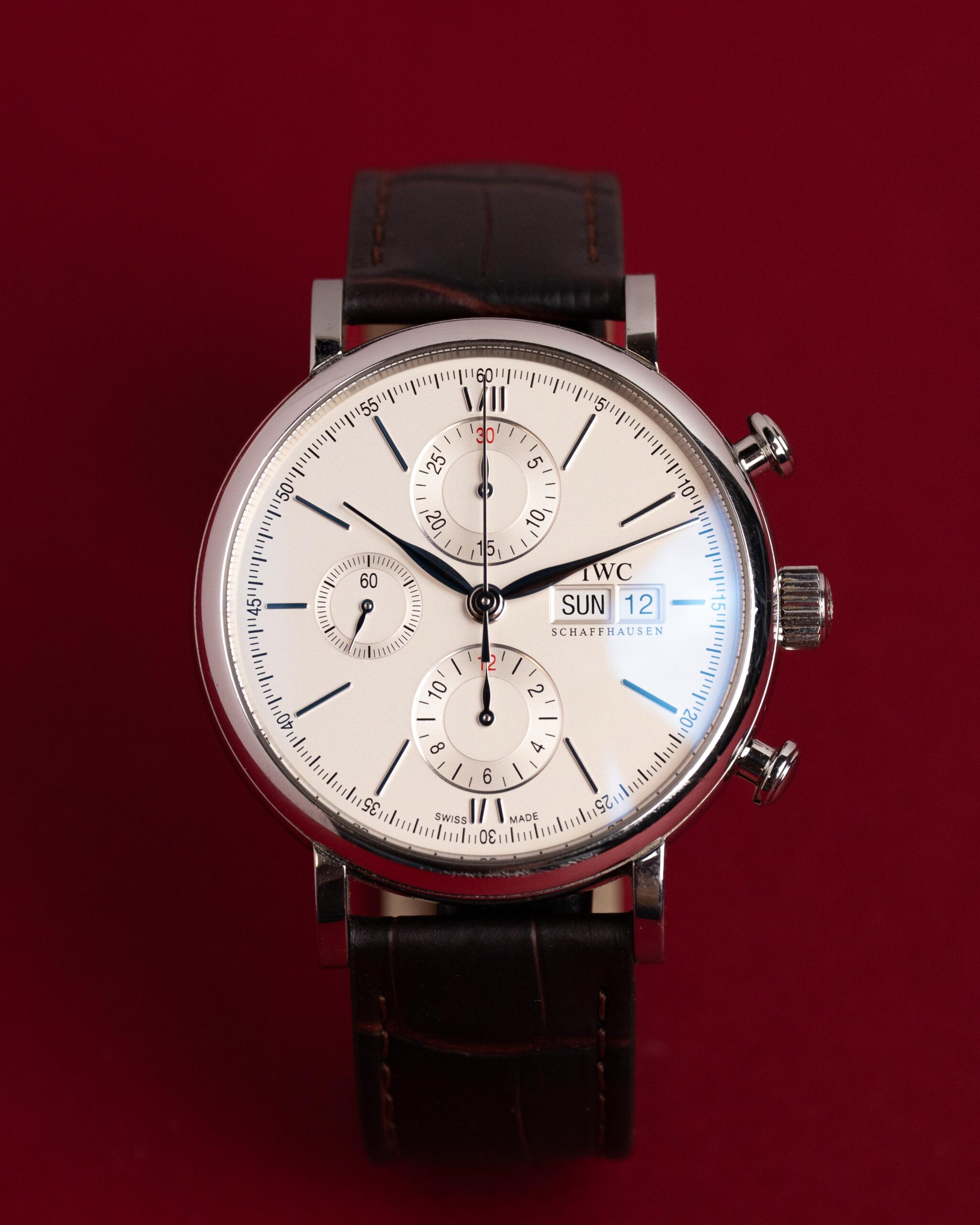 IWC Portofino Chronograph IW391007 to elegancki zegarek męski, który łączy klasyczną estetykę kolekcji Portofino z funkcjonalnością chronografu. Model ten wyróżnia się stonowanym designem inspirowanym włoskim stylem i ponadczasową elegancją.