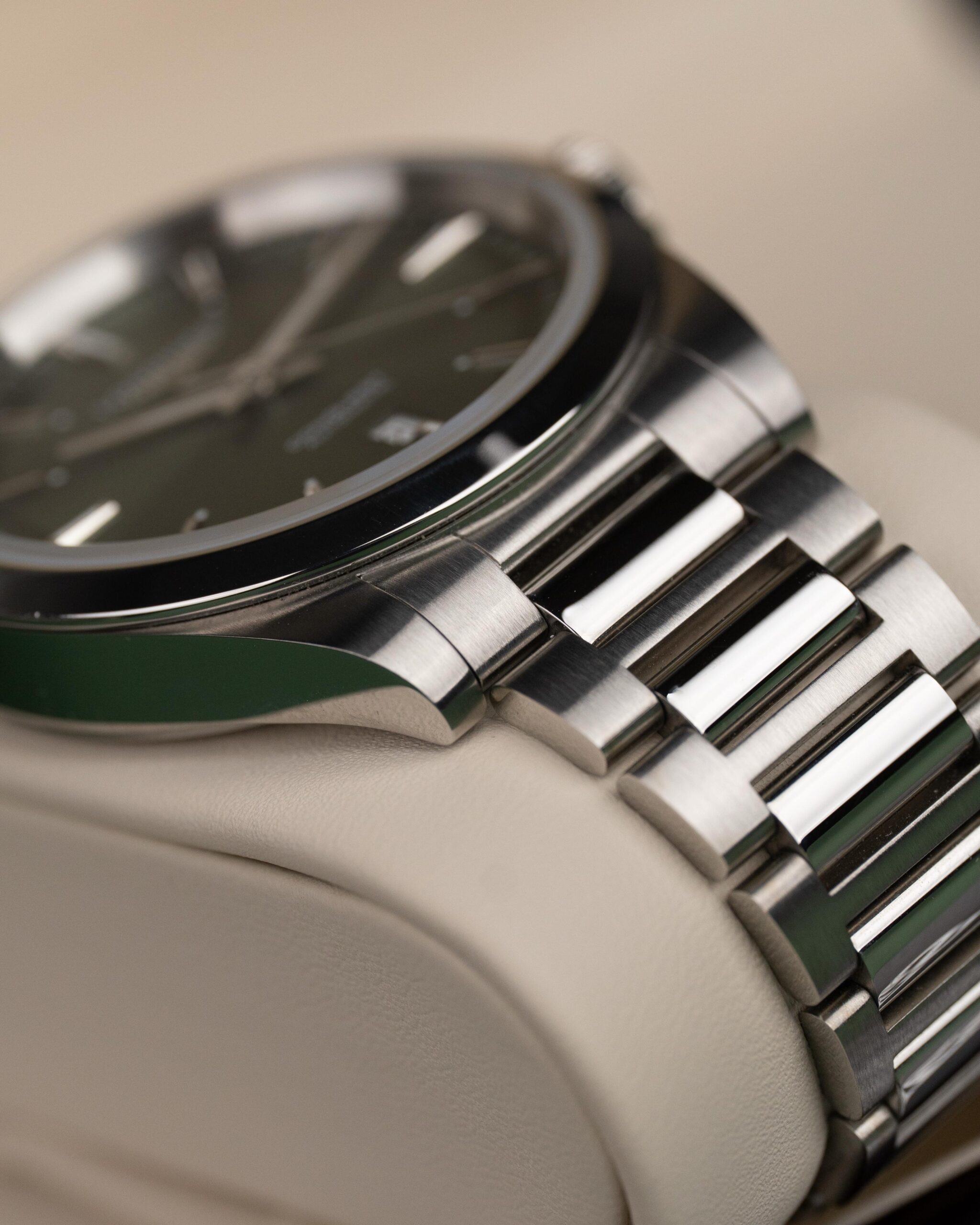 Stalowa koperta o średnicy 41 mm harmonijnie współgra ze srebrzystą tarczą o subtelnym, promienistym wykończeniu. Nakładane indeksy godzinowe, wypełnione masą Super-LumiNova, gwarantują doskonałą czytelność w każdych warunkach, a datownik dyskretnie umieszczony na godzinie 3 podkreśla praktyczny charakter modelu.