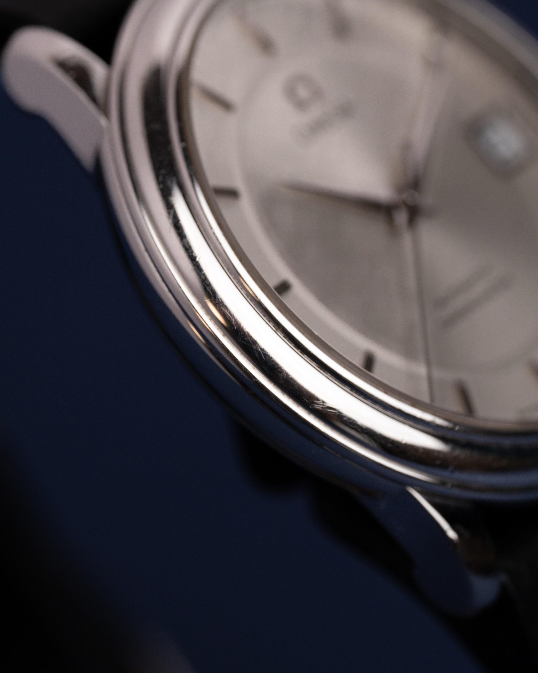 Stalowa koperta o średnicy 34,5 mm zachowuje idealne proporcje, dzięki czemu zegarek świetnie prezentuje się na nadgarstku i bez problemu mieści się pod mankietem koszuli. Jasna, srebrzysta tarcza z delikatnym szlifem słonecznym podkreśla klasyczny charakter modelu. Smukłe indeksy oraz eleganckie wskazówki zapewniają doskonałą czytelność, a datownik umieszczony na godzinie trzeciej dyskretnie zwiększa funkcjonalność zegarka.