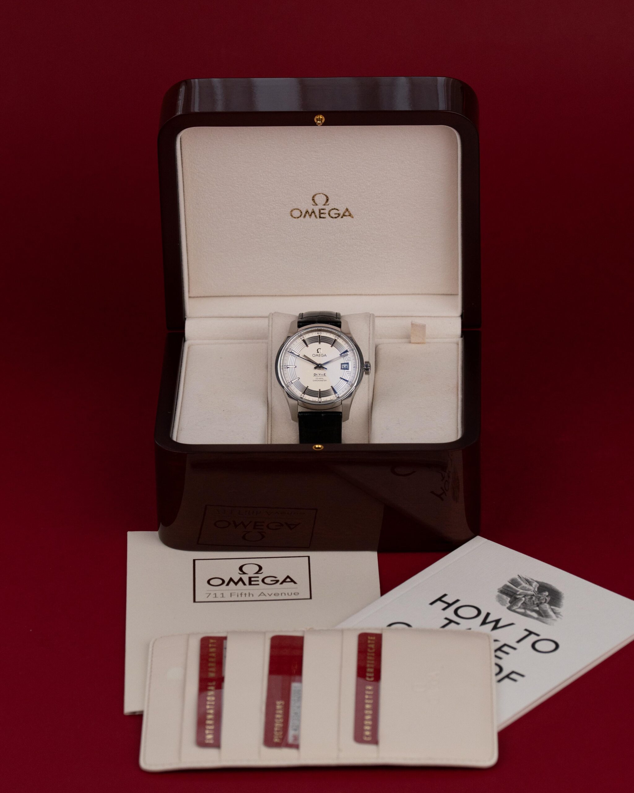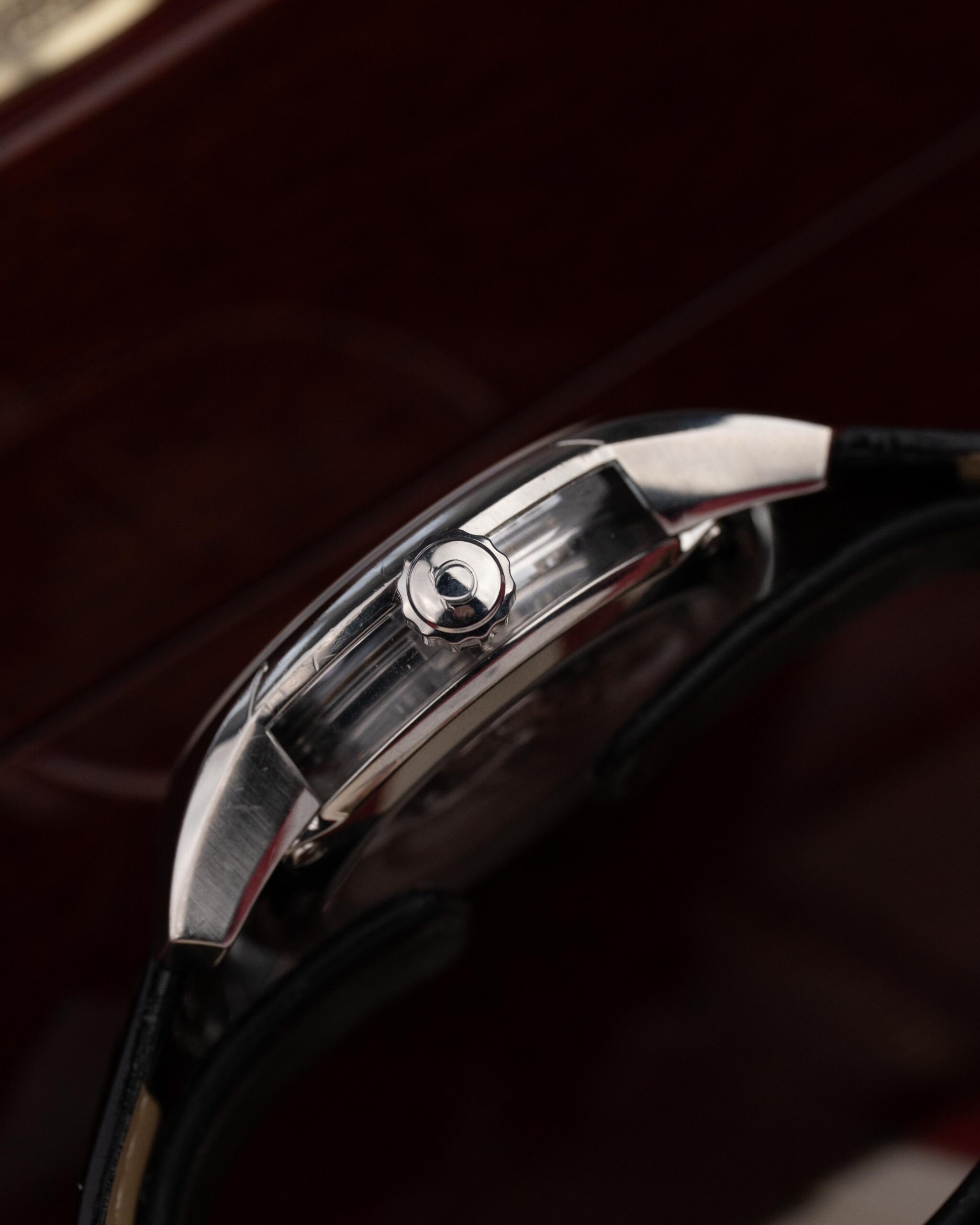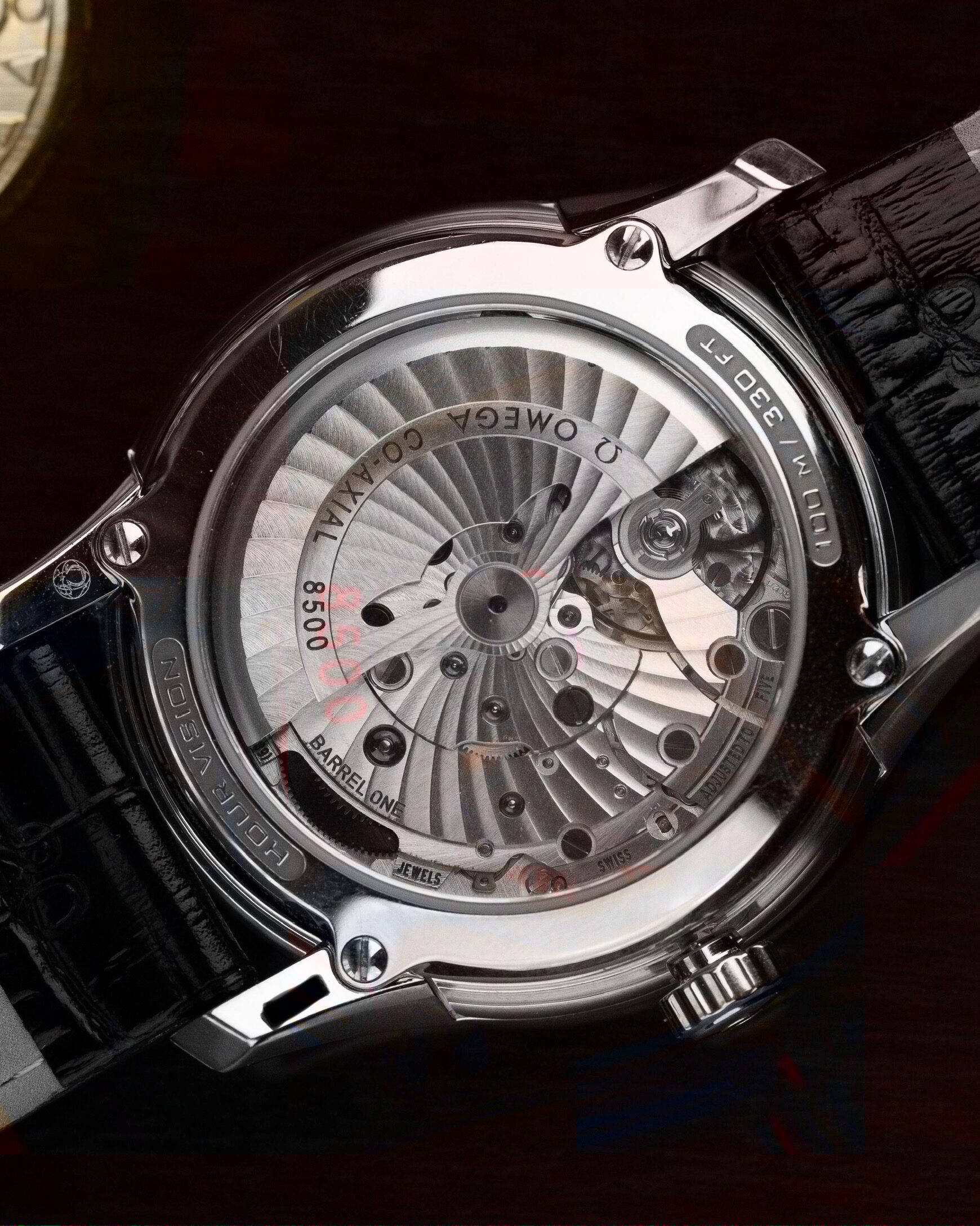 Model napędzany jest automatycznym mechanizmem Omega Co-Axial Calibre 8500, zapewniającym wysoką precyzję oraz około 60 godzin rezerwy chodu. Stalowa koperta o średnicy 41 mm została zestawiona z srebrną tarczą, na której znajdują się eleganckie indeksy, mała sekunda oraz wskaźnik rezerwy chodu, podkreślające klasyczny charakter zegarka.