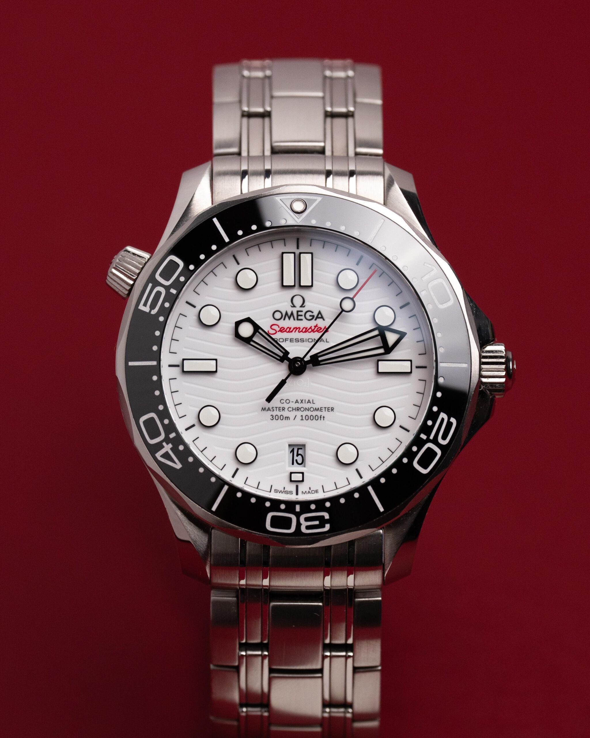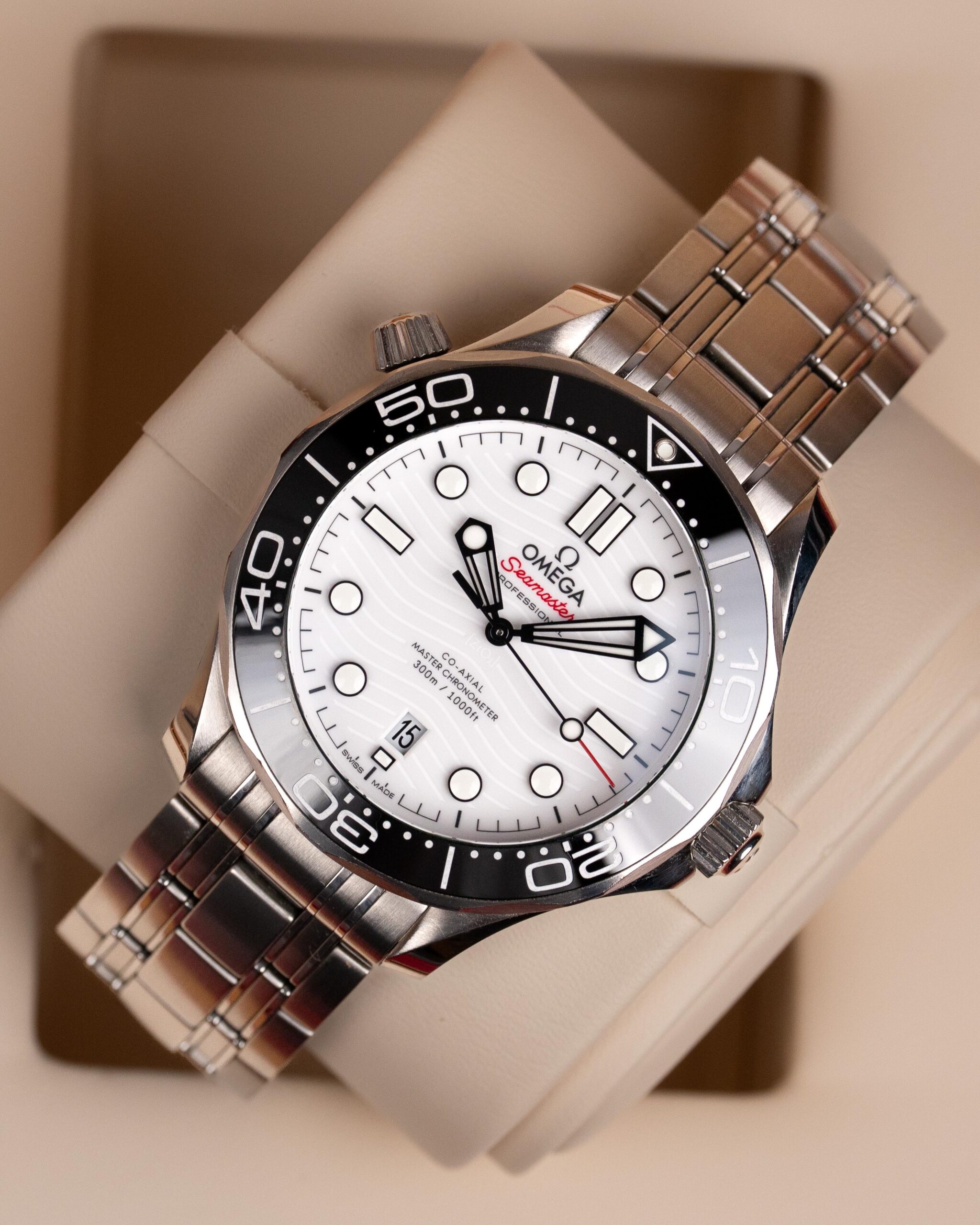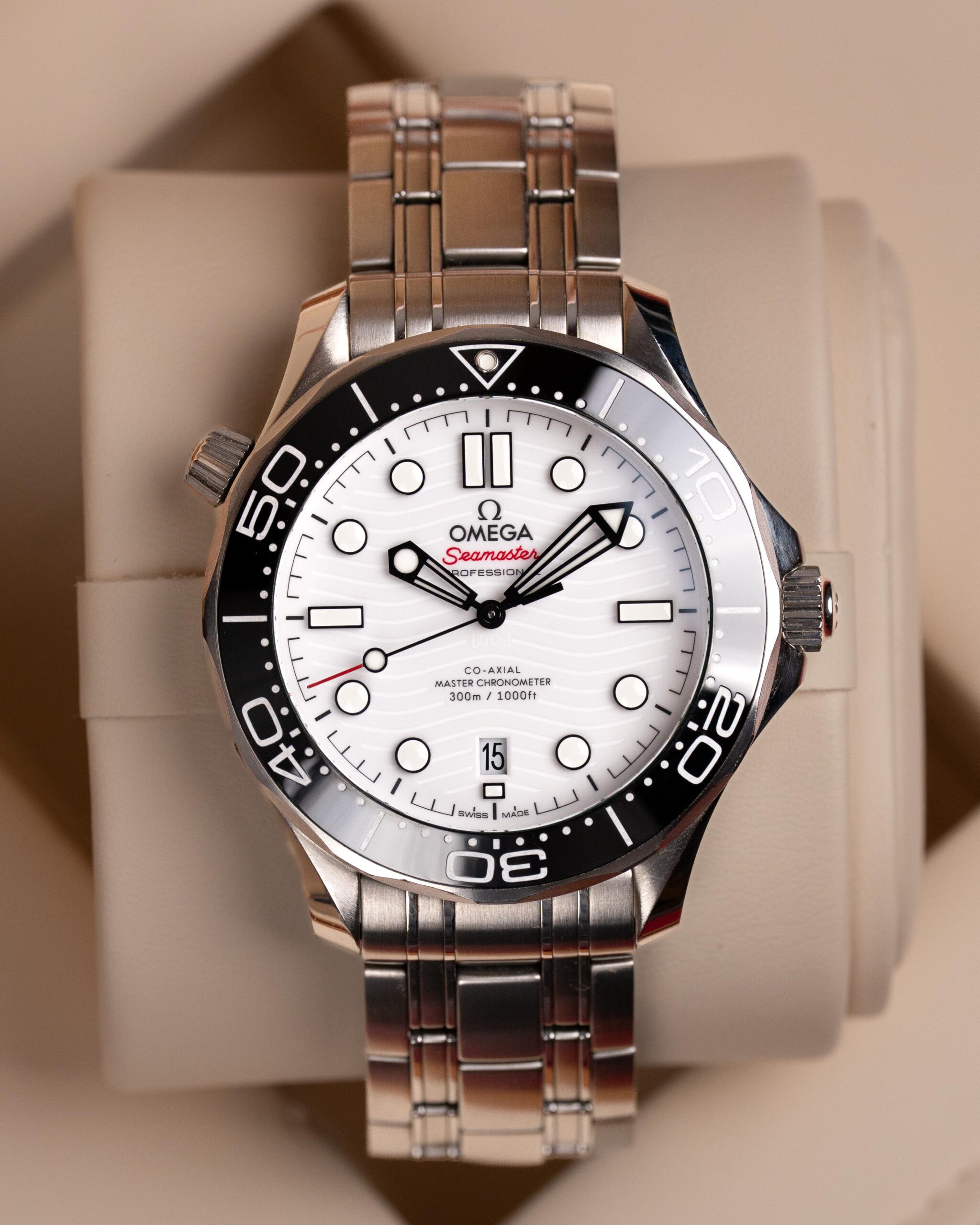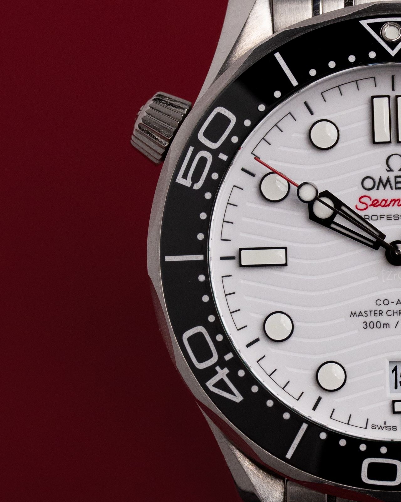 Stalowa koperta o średnicy 42 mm skrywa białą, ceramiczną tarczę ozdobioną falistym giloszowaniem – charakterystycznym motywem linii Diver 300M. Nakładane czarne indeksy i rhodowane wskazówki wypełnione masą Super-LumiNova zapewniają doskonałą czytelność w każdych warunkach, a datownik na godzinie szóstej harmonijnie dopełnia kompozycji.