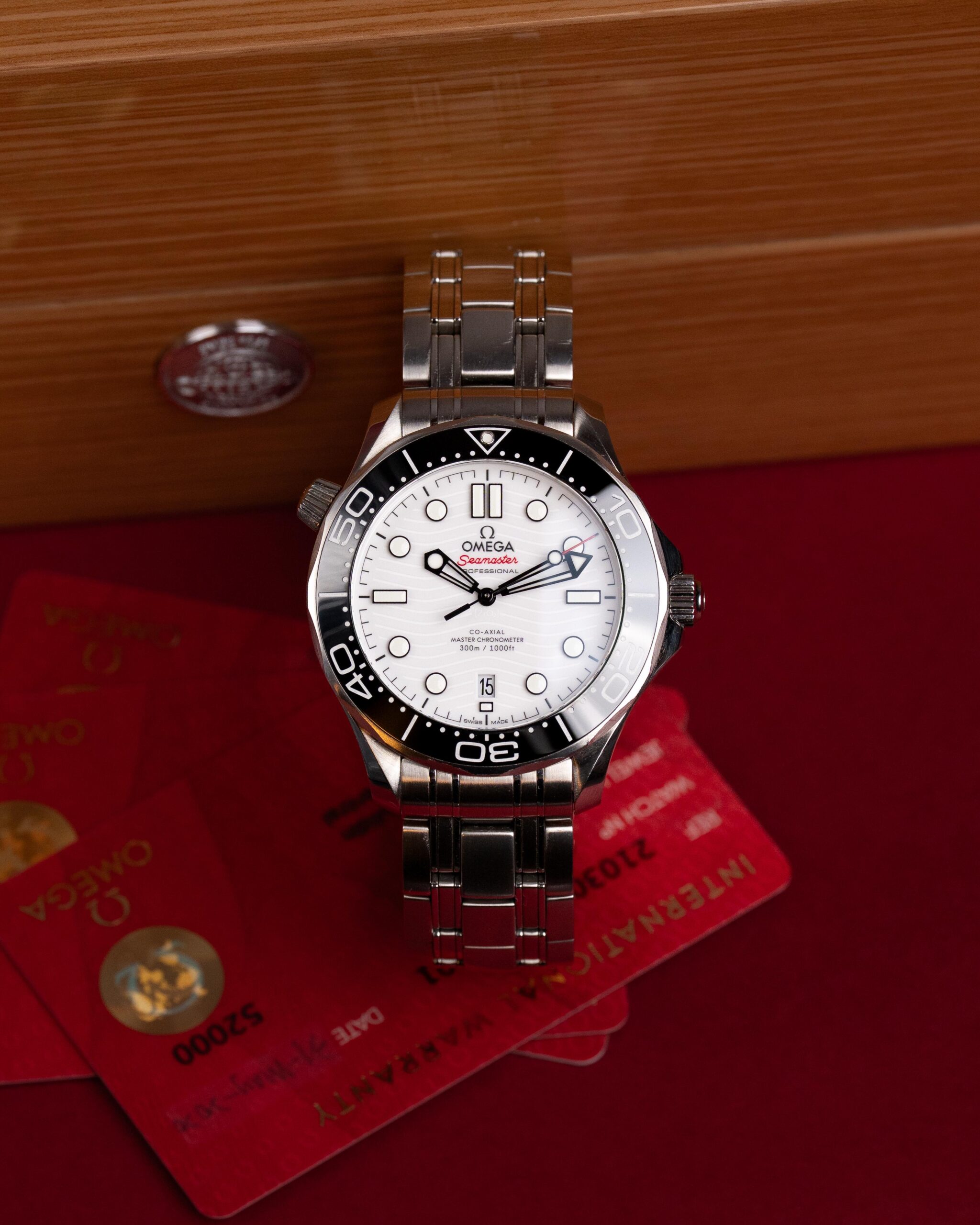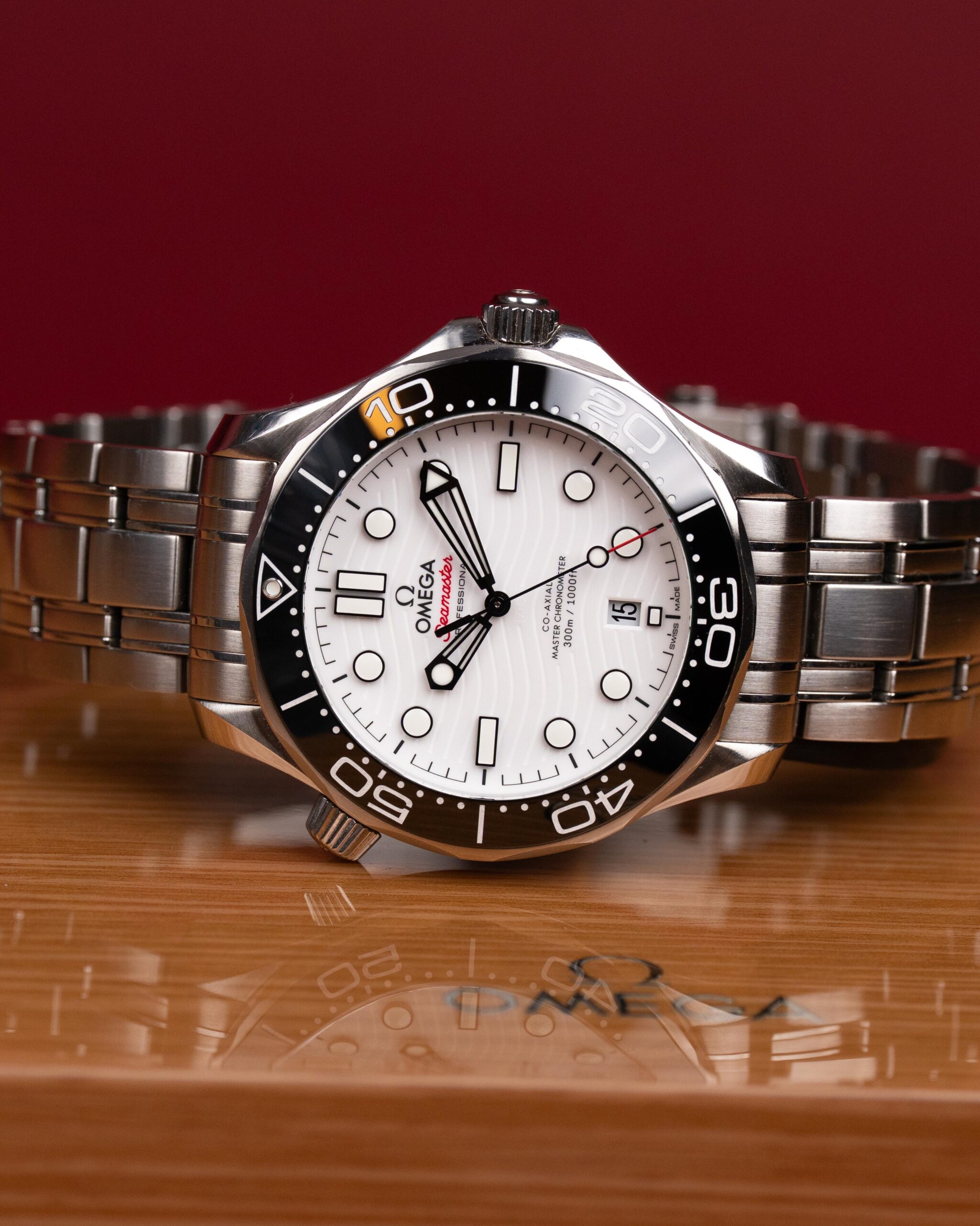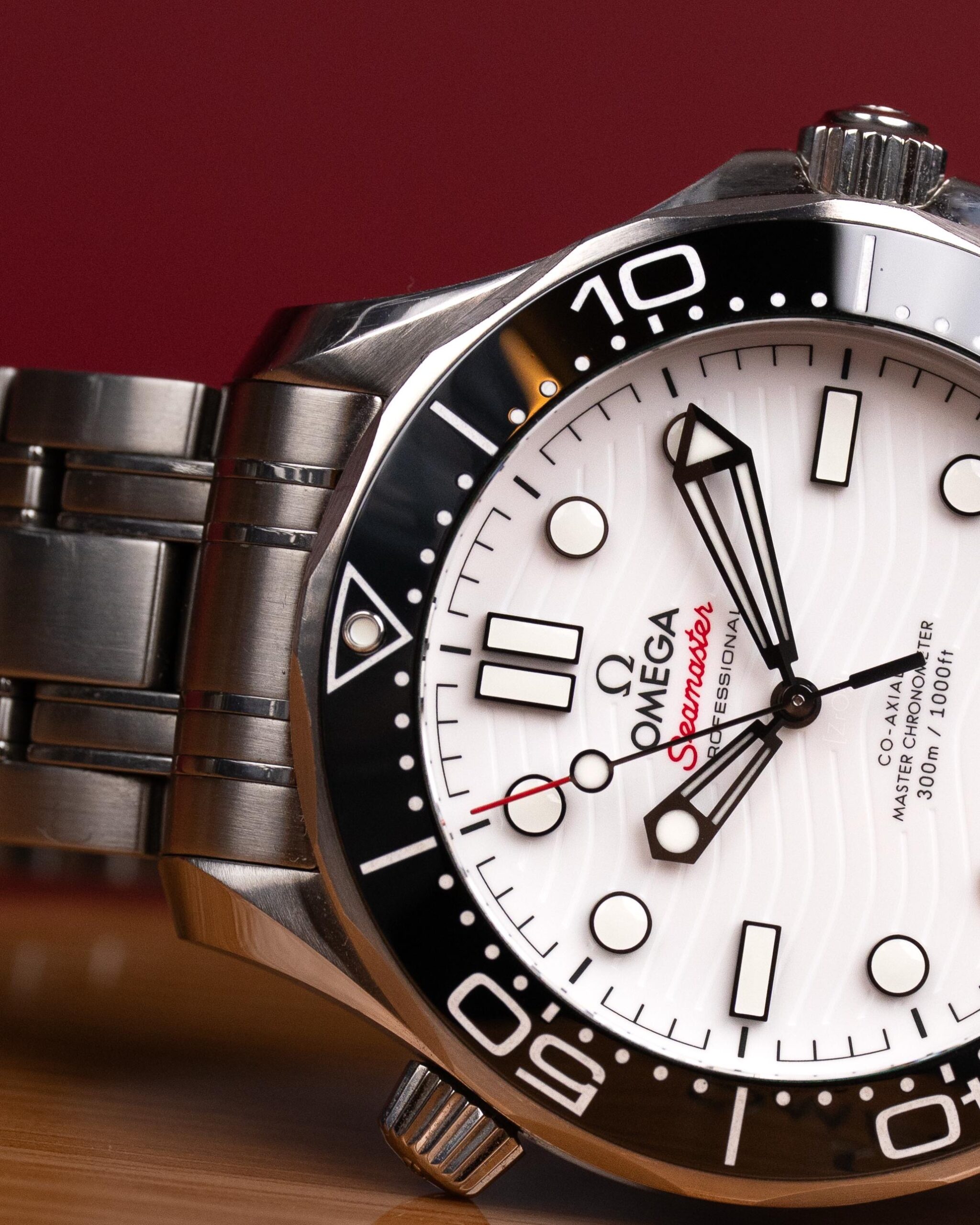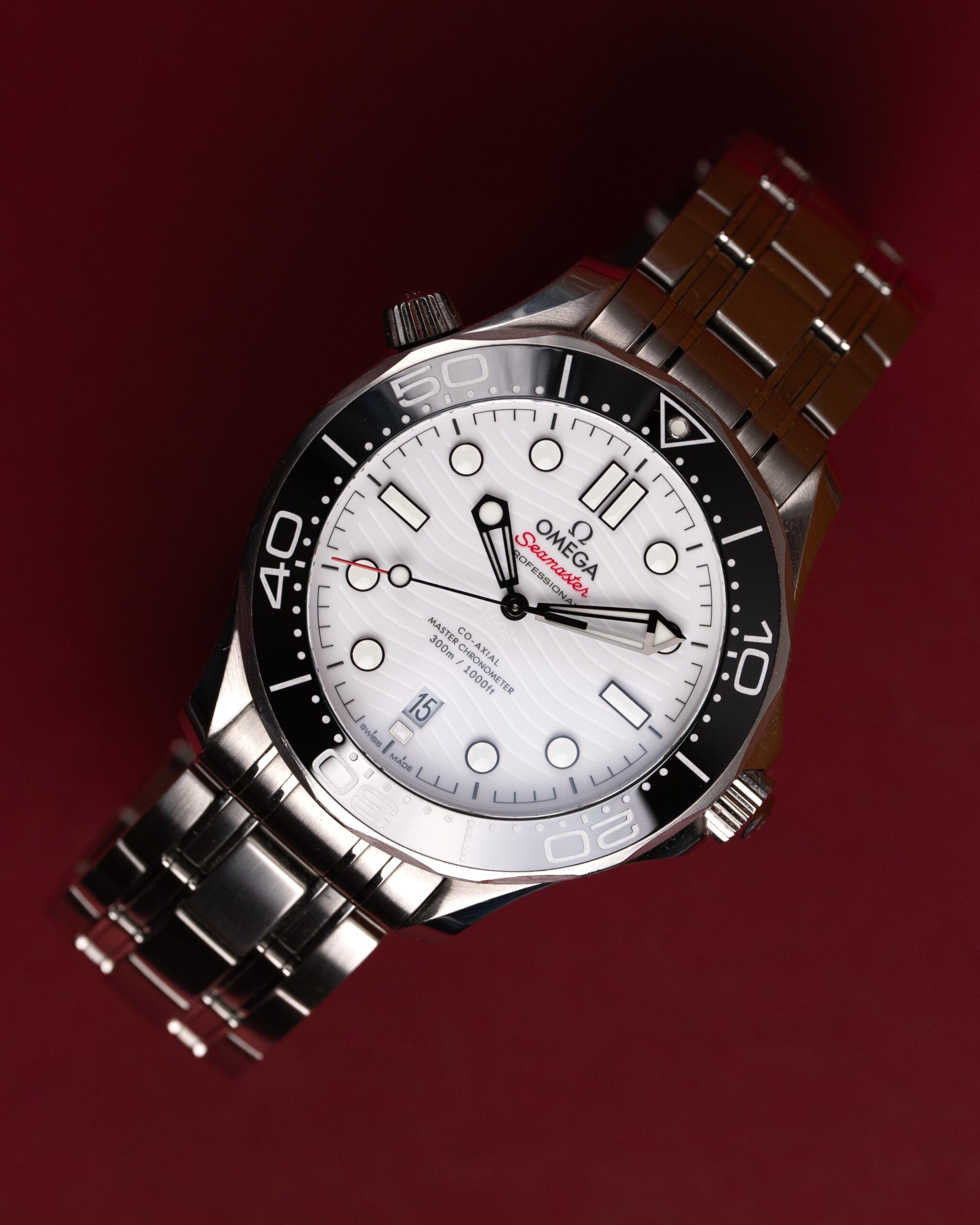 Stalowa koperta o średnicy 42 mm skrywa białą, ceramiczną tarczę ozdobioną falistym giloszowaniem – charakterystycznym motywem linii Diver 300M. Nakładane czarne indeksy i rhodowane wskazówki wypełnione masą Super-LumiNova zapewniają doskonałą czytelność w każdych warunkach, a datownik na godzinie szóstej harmonijnie dopełnia kompozycji.