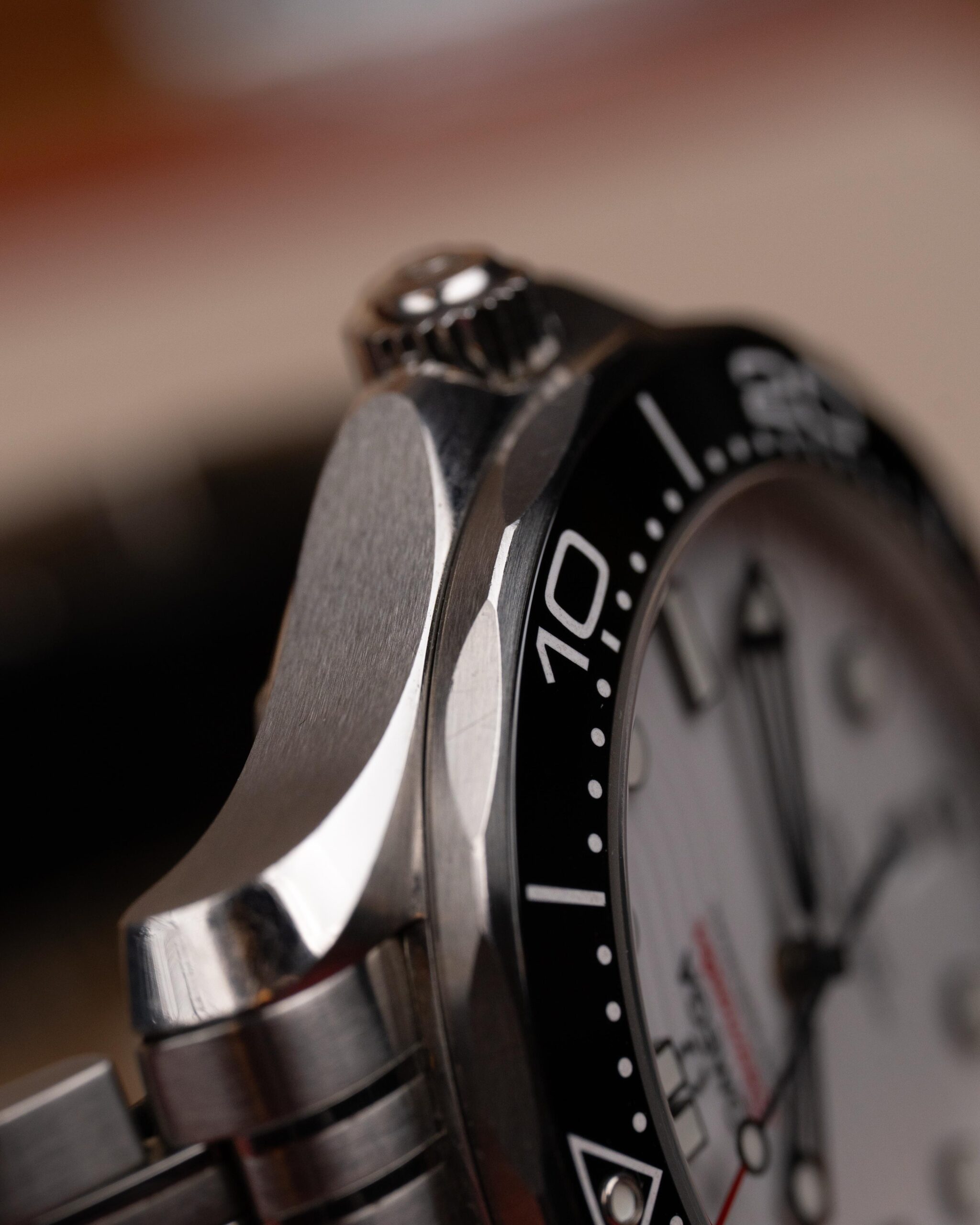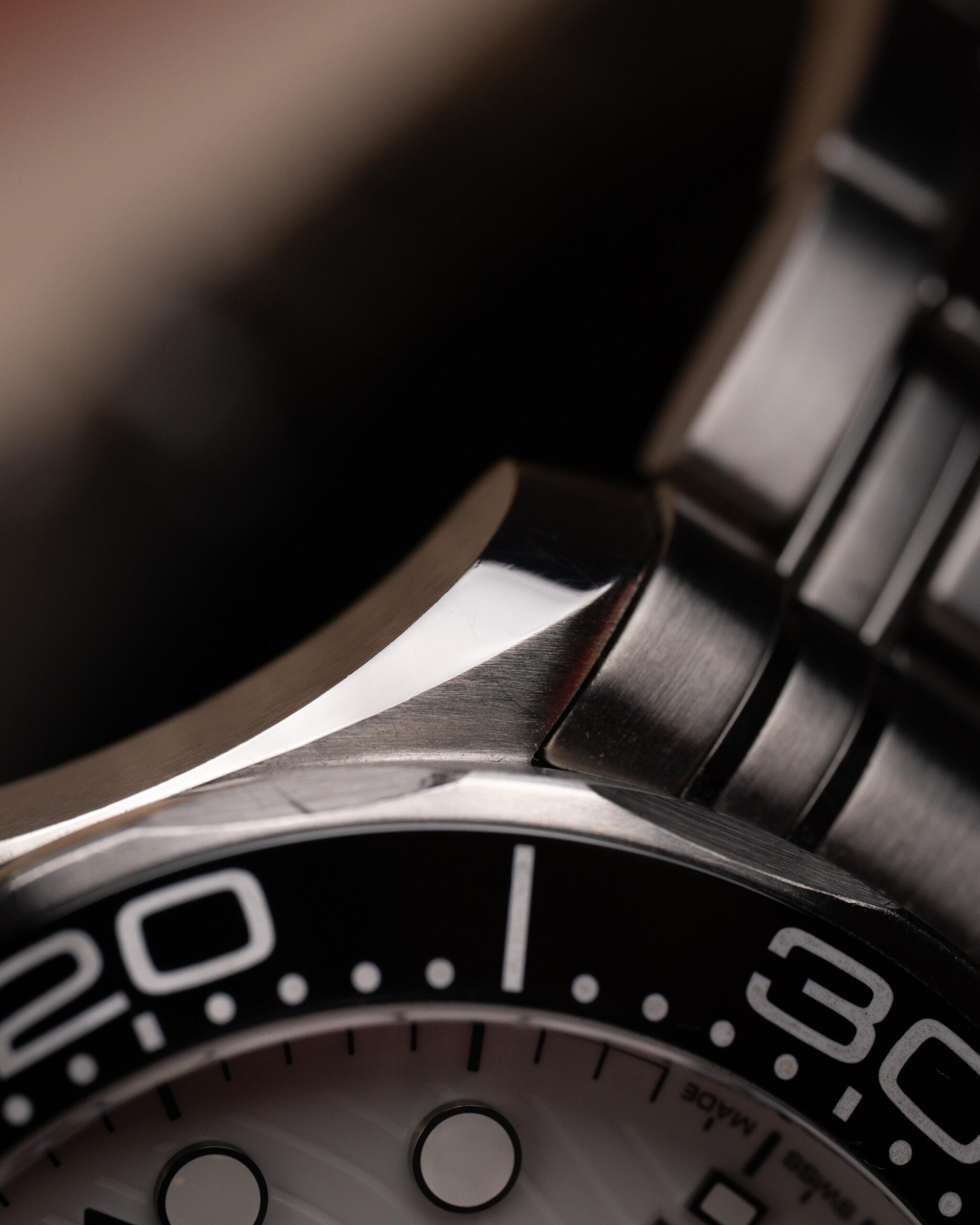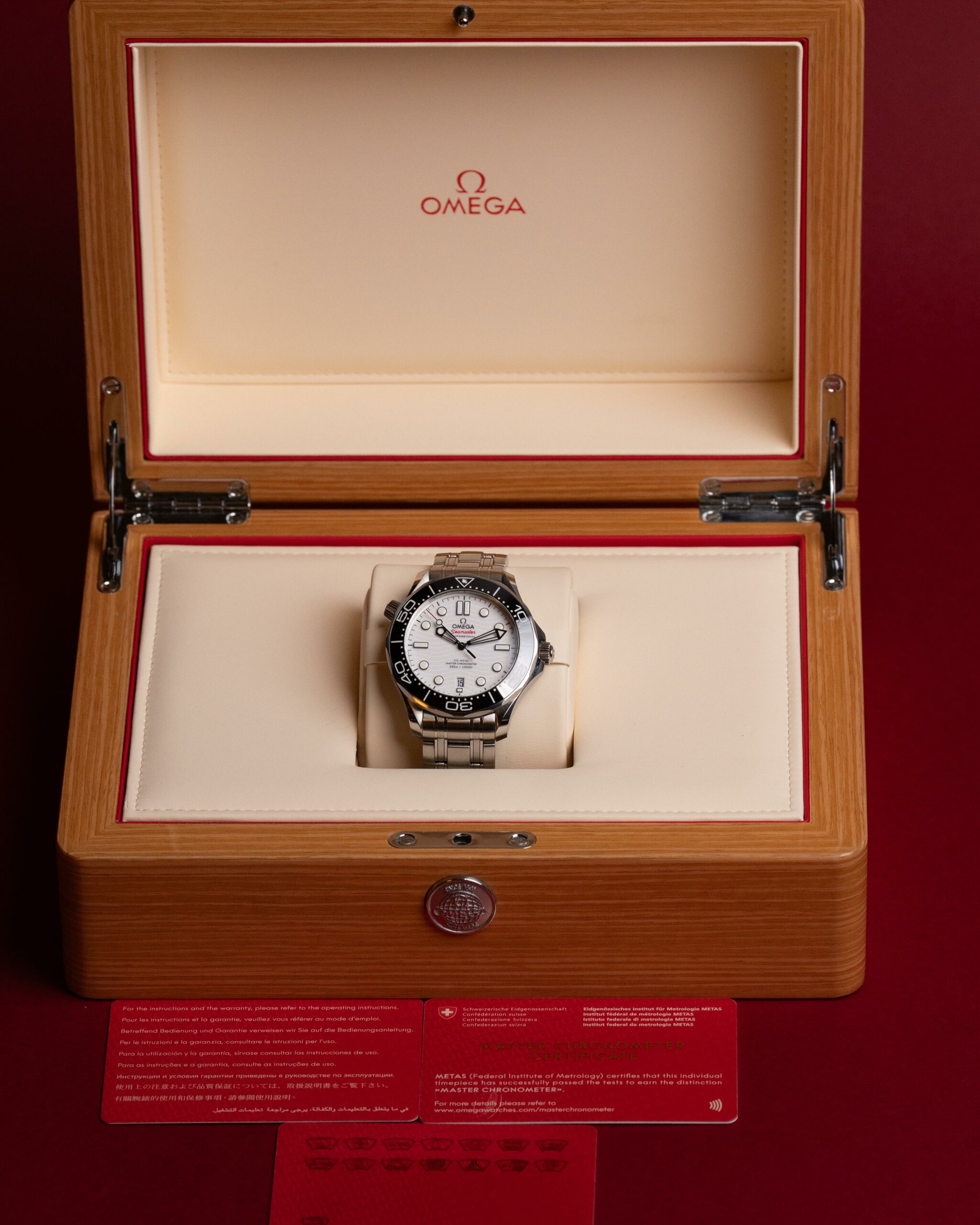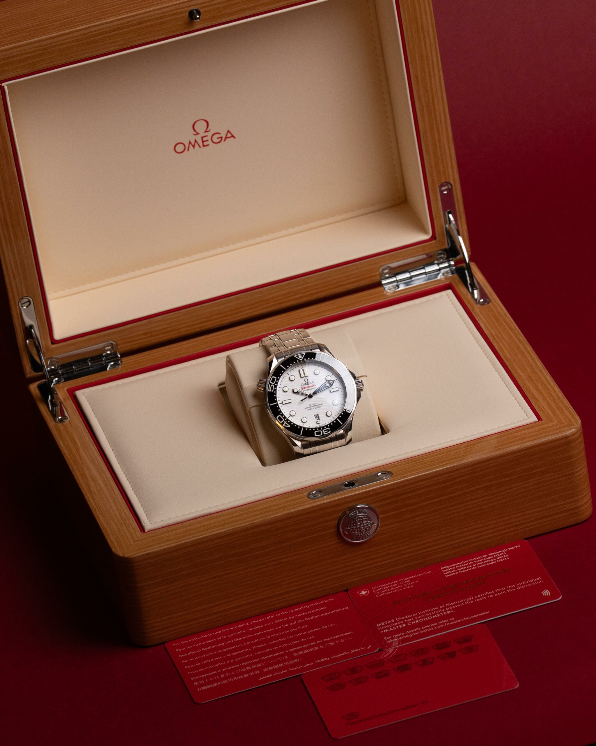 Stalowa koperta o średnicy 42 mm skrywa białą, ceramiczną tarczę ozdobioną falistym giloszowaniem – charakterystycznym motywem linii Diver 300M. Nakładane czarne indeksy i rhodowane wskazówki wypełnione masą Super-LumiNova zapewniają doskonałą czytelność w każdych warunkach, a datownik na godzinie szóstej harmonijnie dopełnia kompozycji.