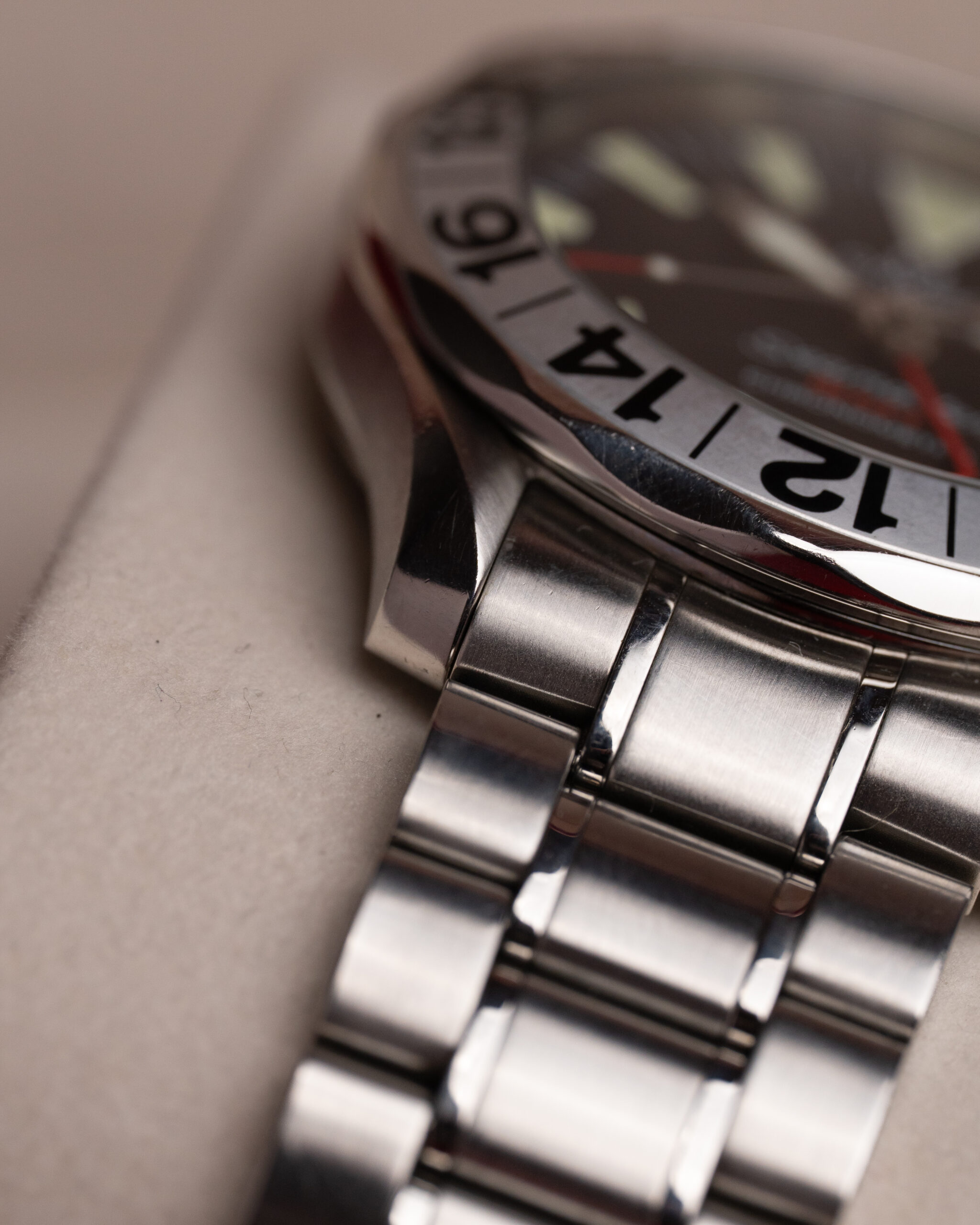 Model wyposażono w mechanizm automatyczny Omega Calibre 1128 – stabilny, dokładny i zaprojektowany specjalnie z myślą o funkcji GMT. Oferuje on płynną pracę oraz datownik umieszczony na godzinie trzeciej.