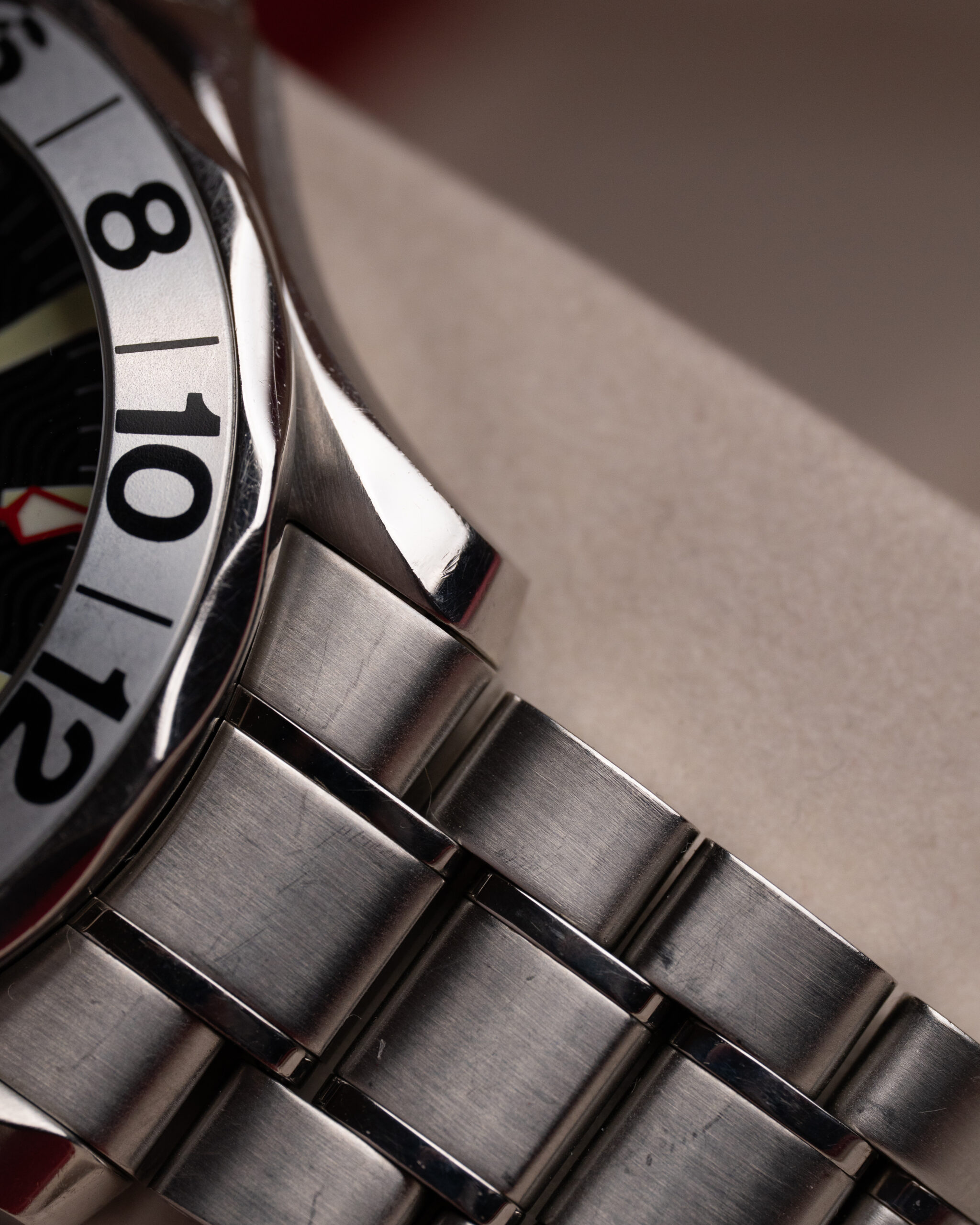 Stalowa koperta o średnicy 41 mm prezentuje się solidnie, ale jednocześnie zachowuje wygodę codziennego noszenia. Czarna tarcza z kultowym falistym giloszowaniem wyróżnia się świetną czytelnością, a duże indeksy i wskazówki pokryto masą luminescencyjną Super-LumiNova. Dodatkowa, czerwona wskazówka GMT umożliwia łatwy odczyt czasu w drugiej strefie.
