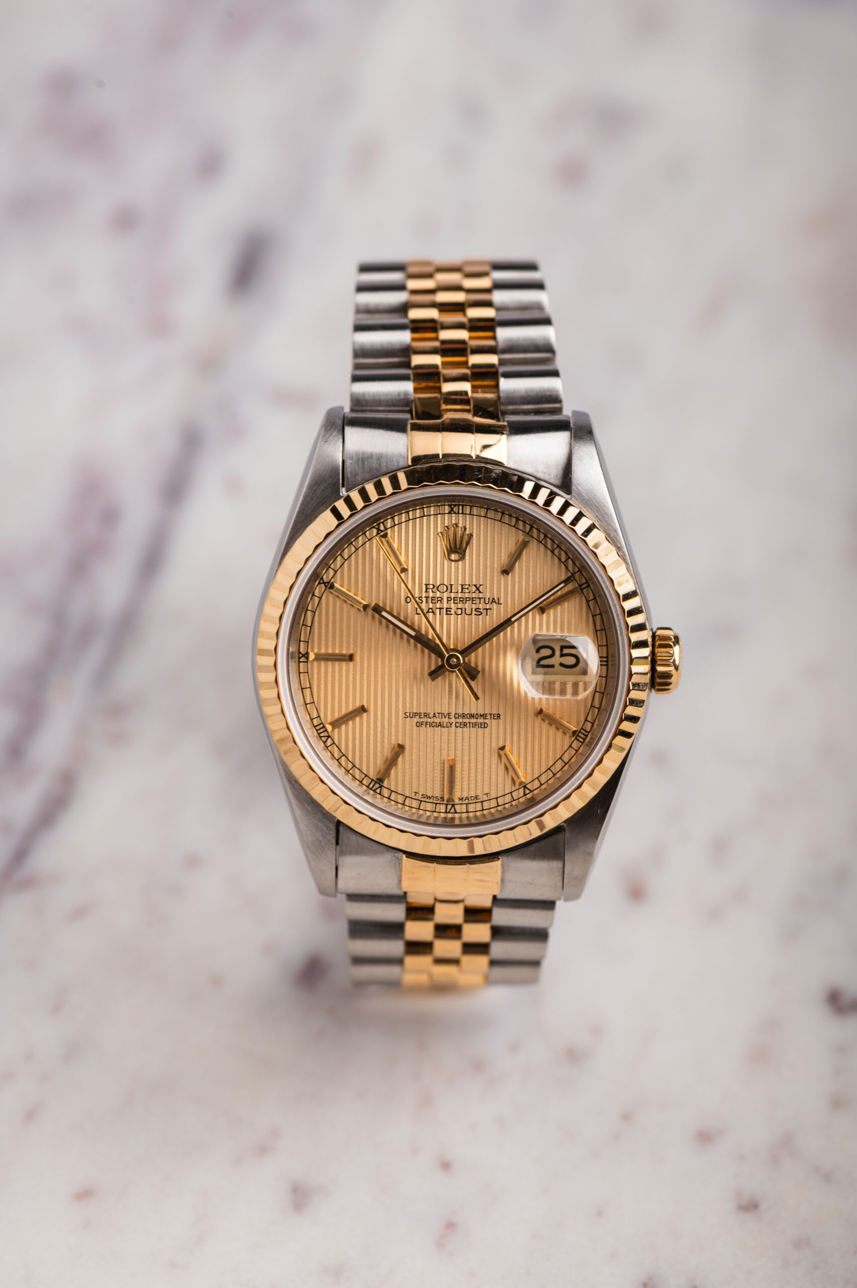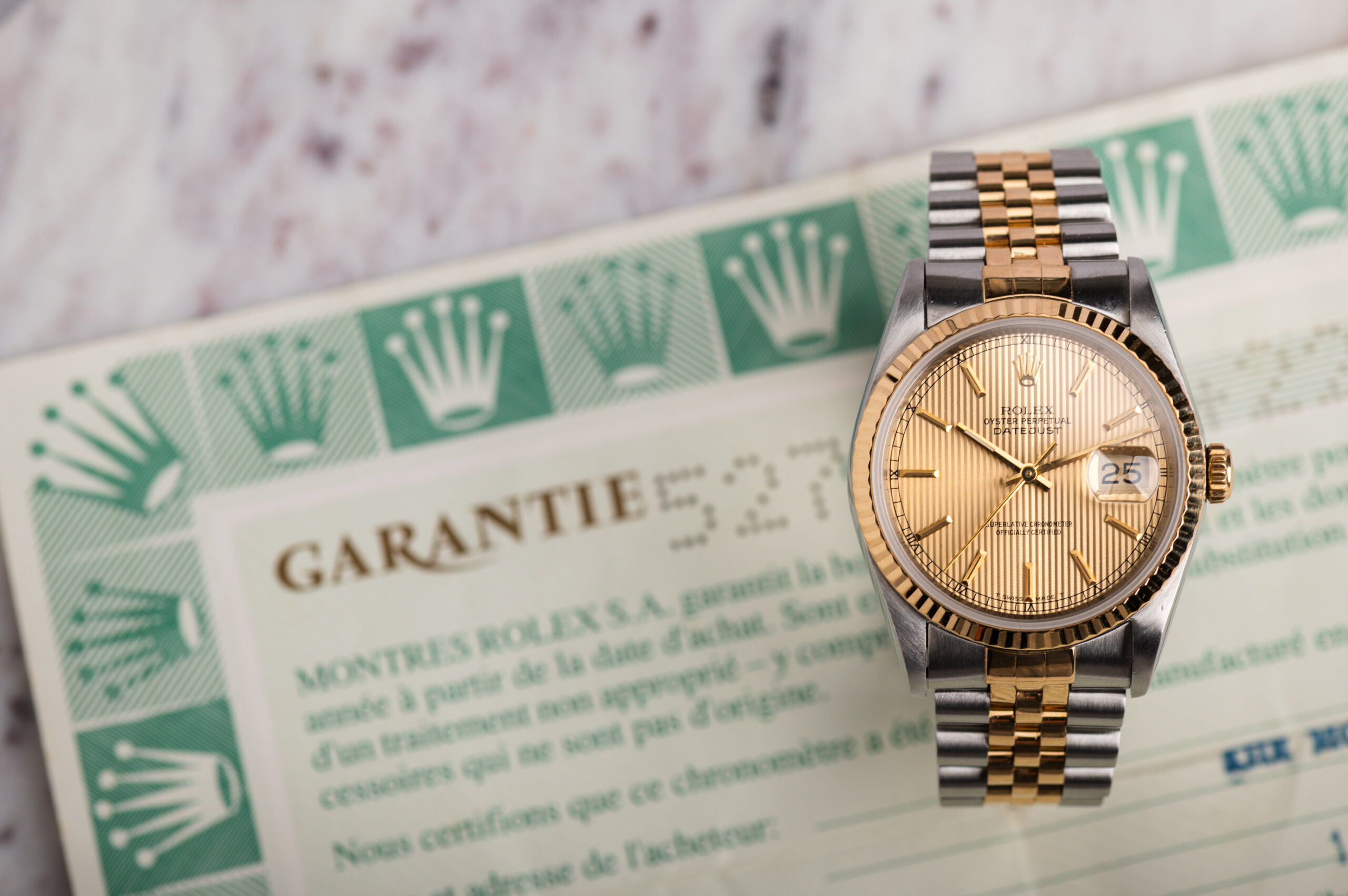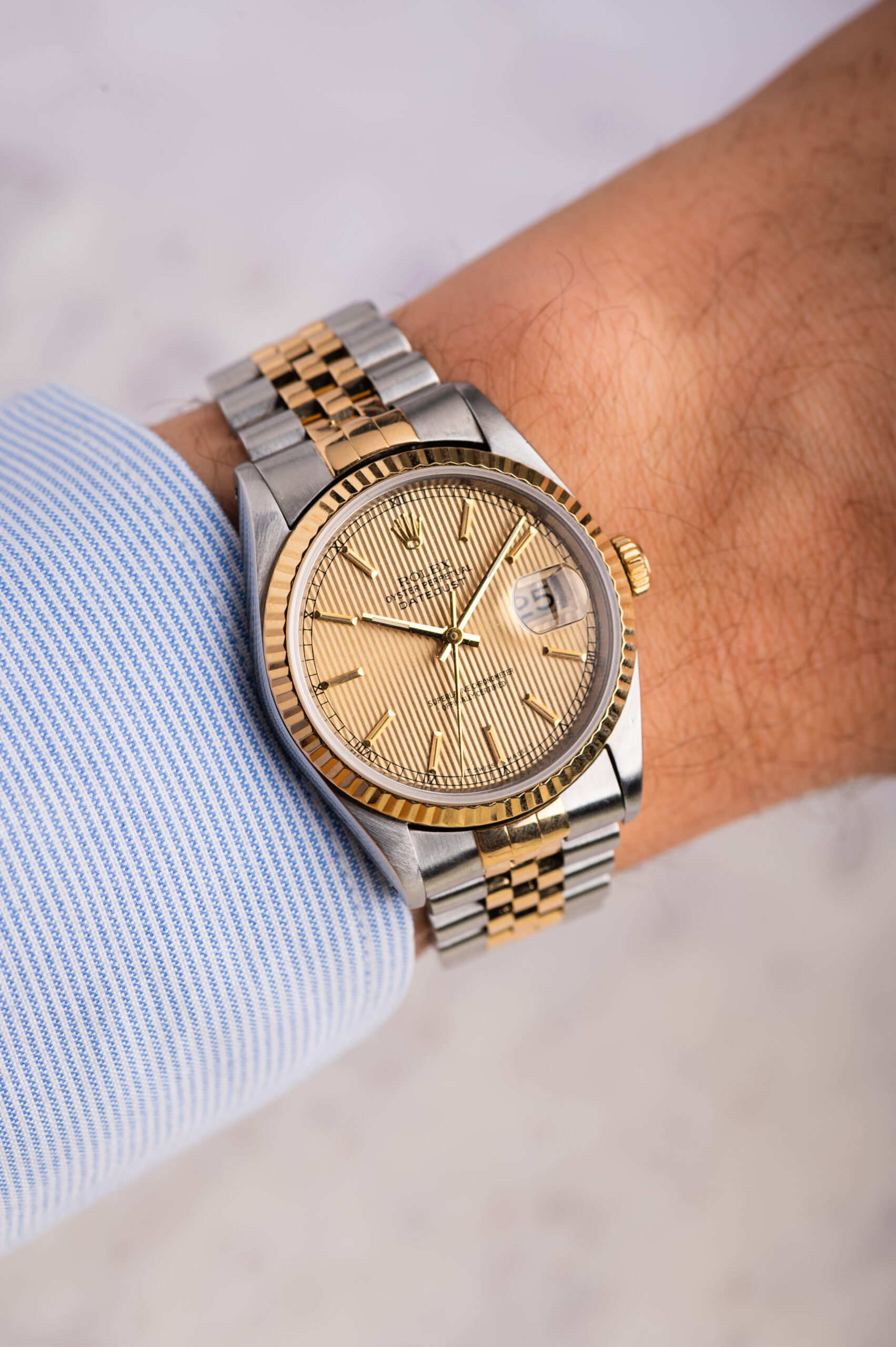 Zegarek Rolex Datejust 16233 był produkowany w latach 1988–2005 i oferuje połączenie klasyki z niezawodnością mechanizmu kaliber 3135. Karbowany bezel z żółtego złota, stalowo-złota konstrukcja i elegancki wygląd czynią z modelu Rolex 16233 jeden z najchętniej wybieranych Datejustów.