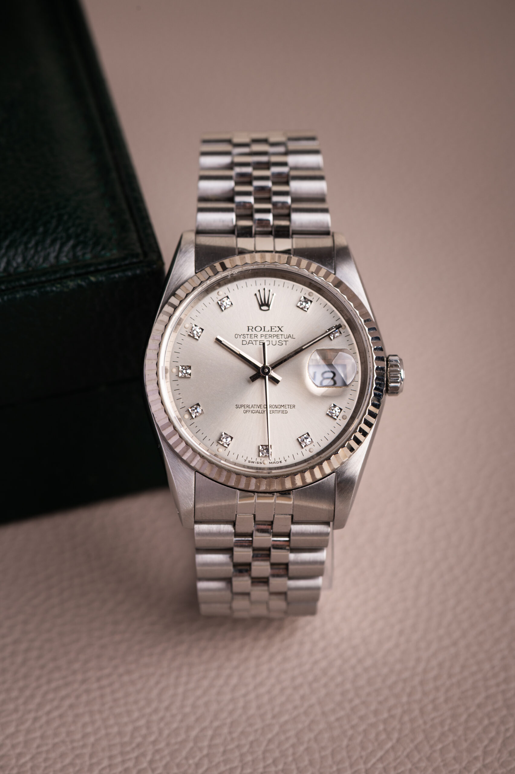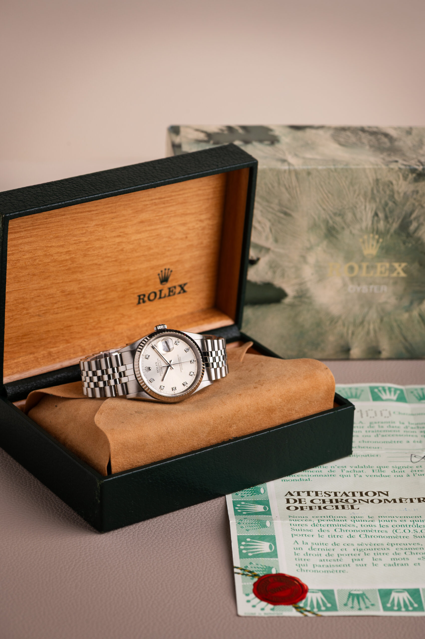 Rolex 16234 to model z lat 1988–2005, który łączy stalową kopertę z karbowanym bezelem z białego złota i automatycznym mechanizmem kaliber 3135. Zegarek Rolex Datejust 16234 to doskonała propozycja dla osób ceniących luksus i klasyczną estetykę w codziennym wydaniu.