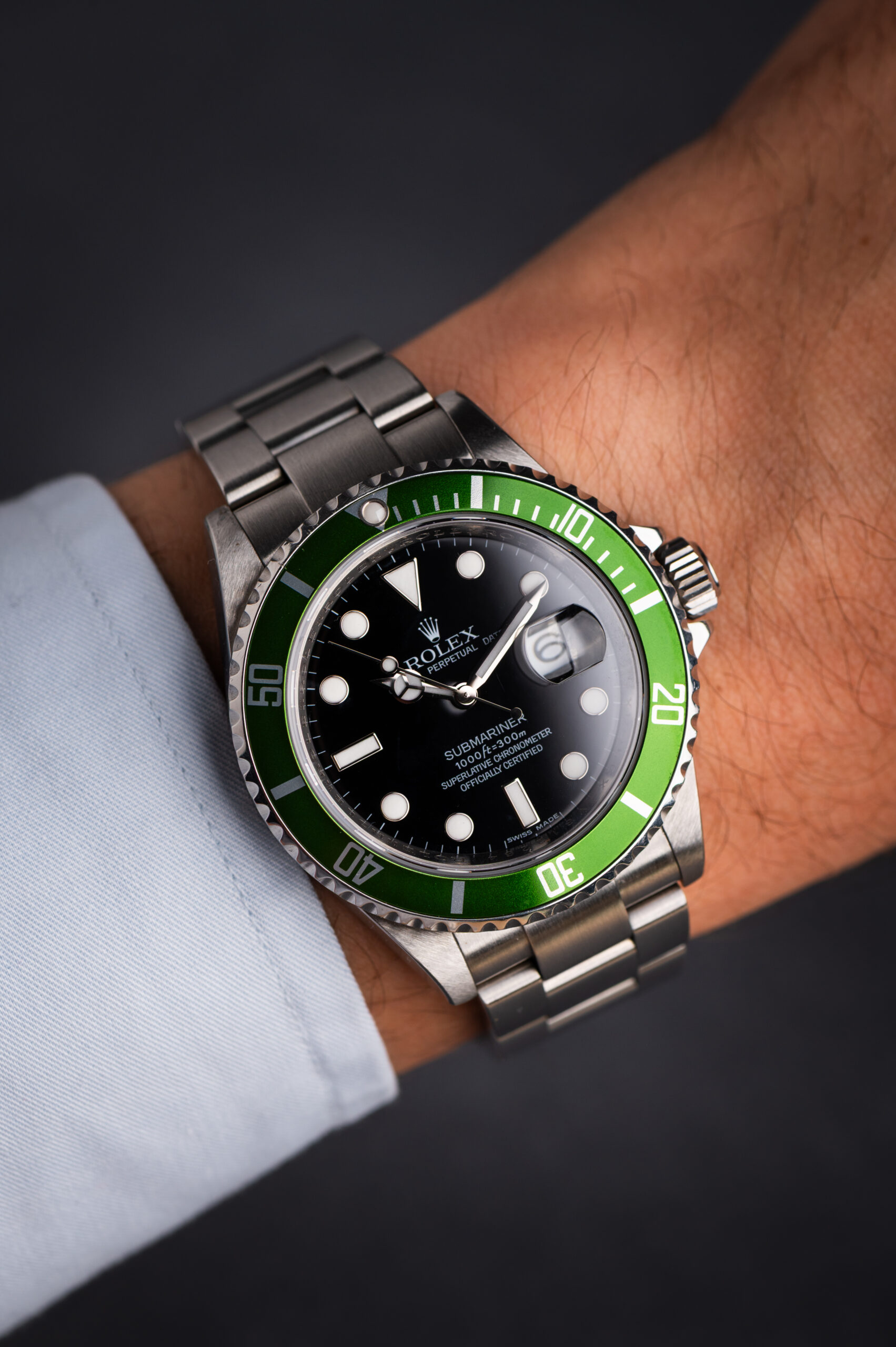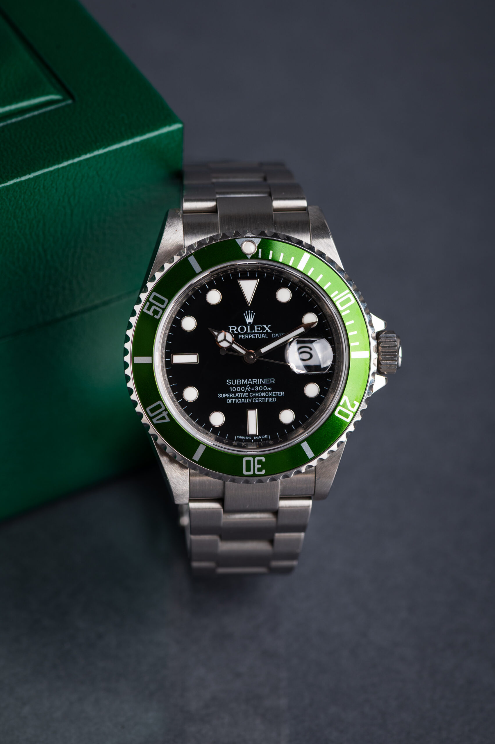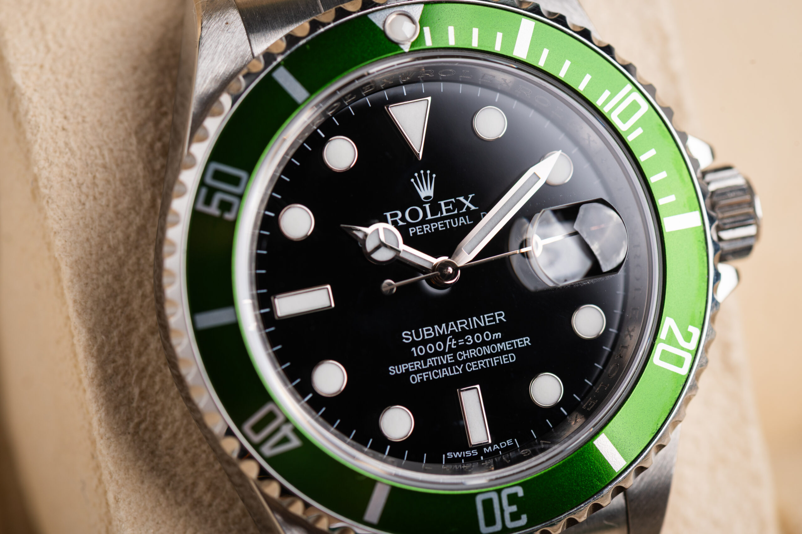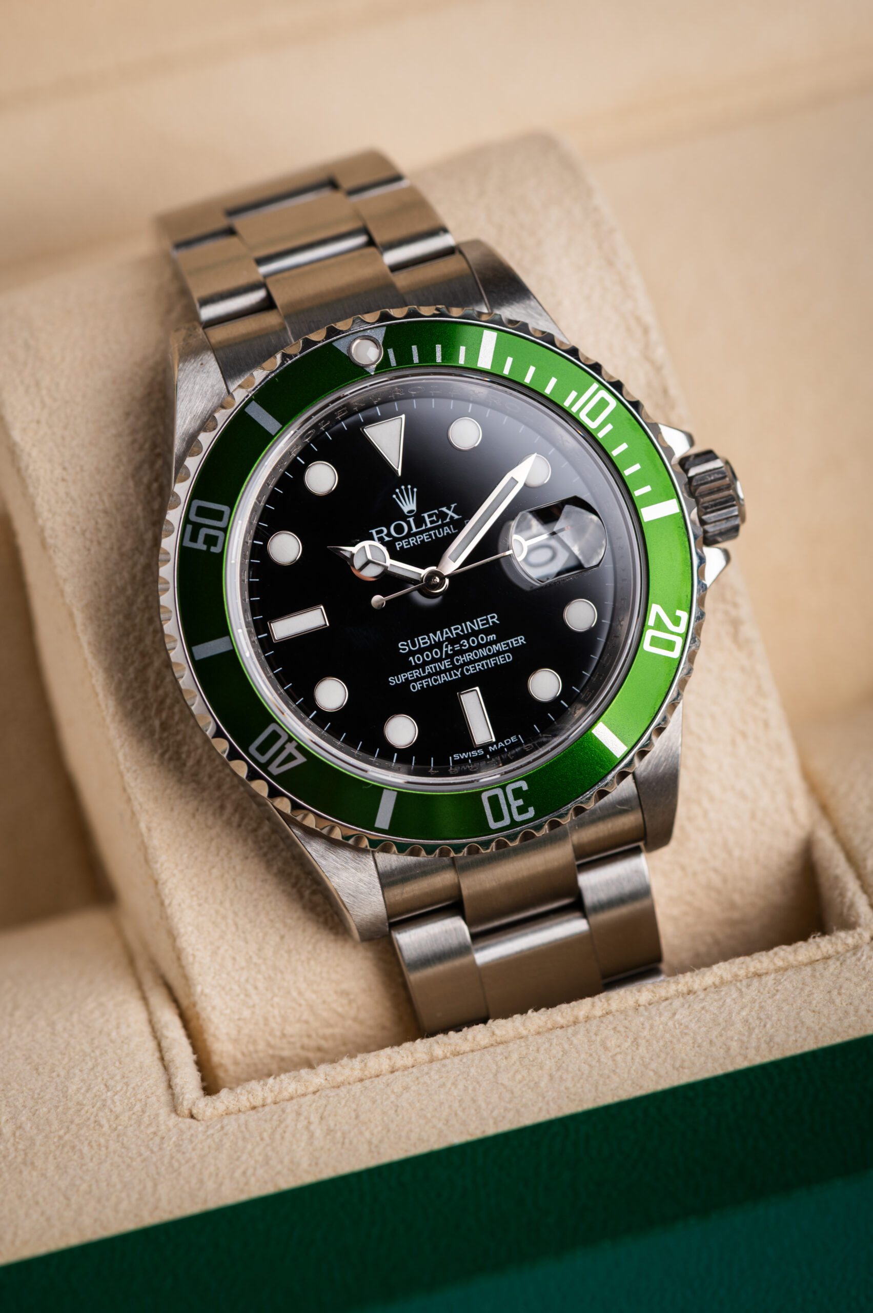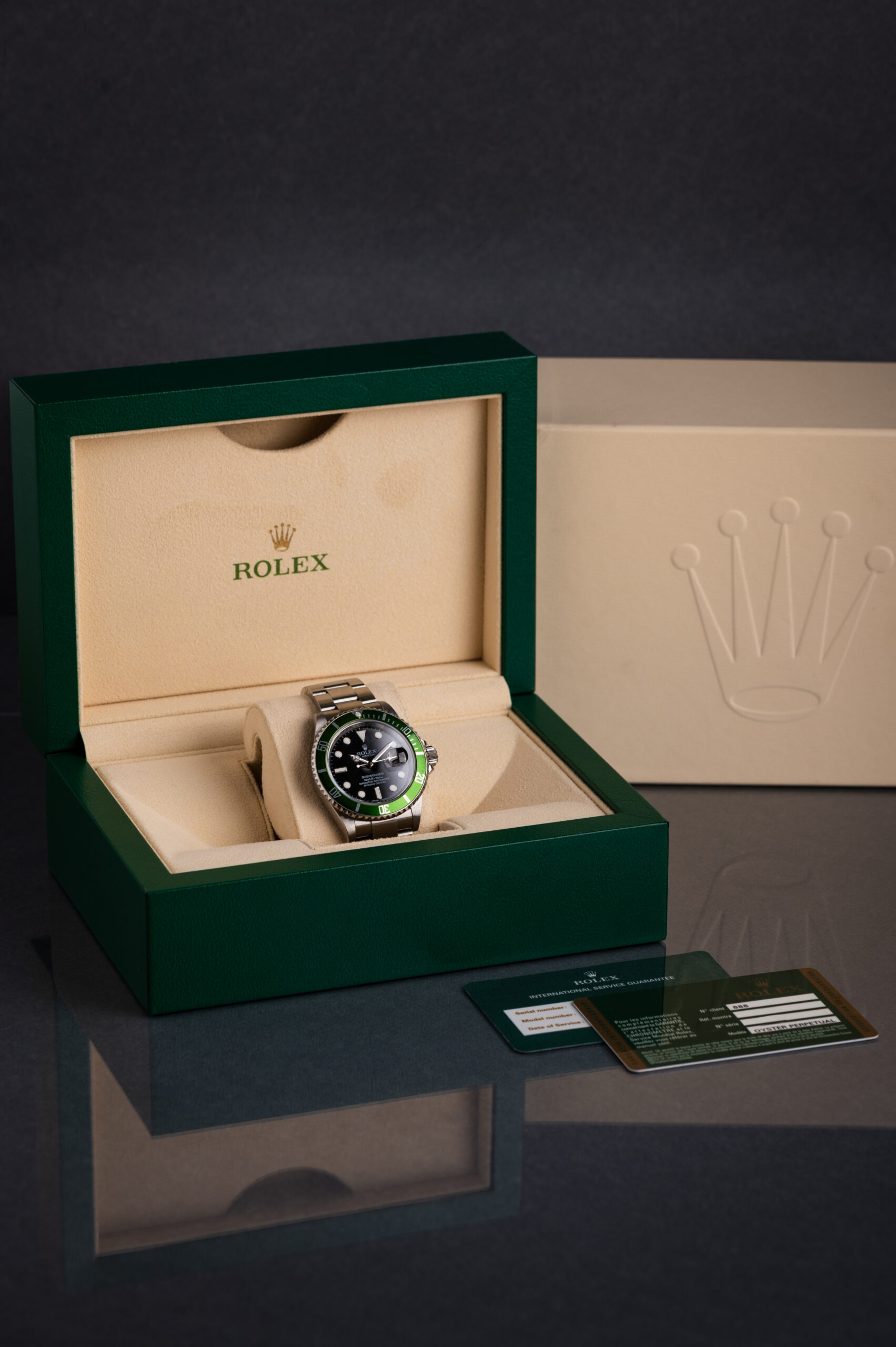 Rolex Submariner 16610LV „Kermit” z 2010 roku – limitowana edycja upamiętniająca 50-lecie modelu Submariner. Wyposażony w automatyczny mechanizm Rolex Calibre 3135 z datownikiem, certyfikowany przez COSC. Charakteryzuje się zielonym bezelem i tzw. maxi dialem, co czyni go jednym z najbardziej rozpoznawalnych Subów. Egzemplarz w pełnym zestawie (Full Set), w stanie kolekcjonerskim.