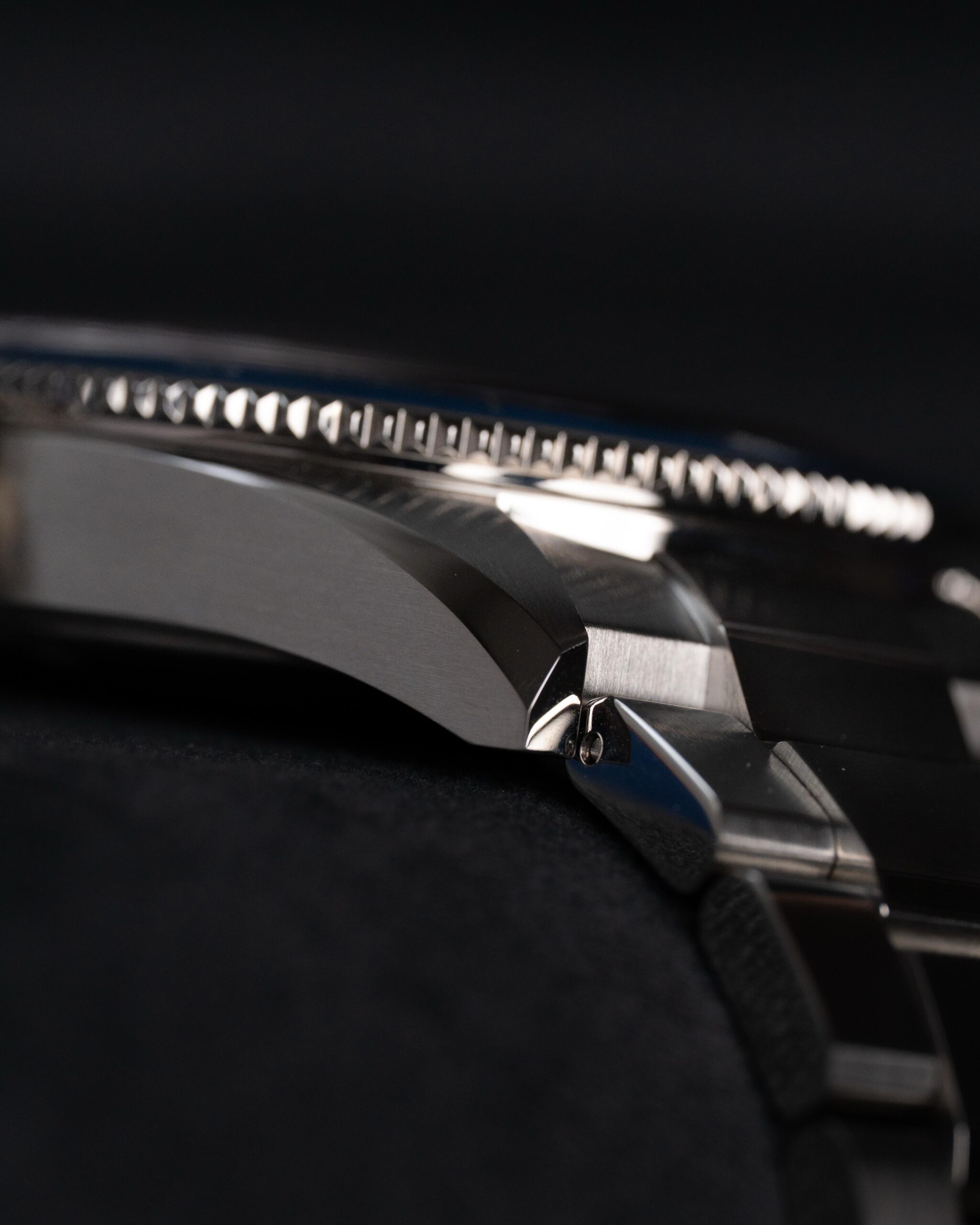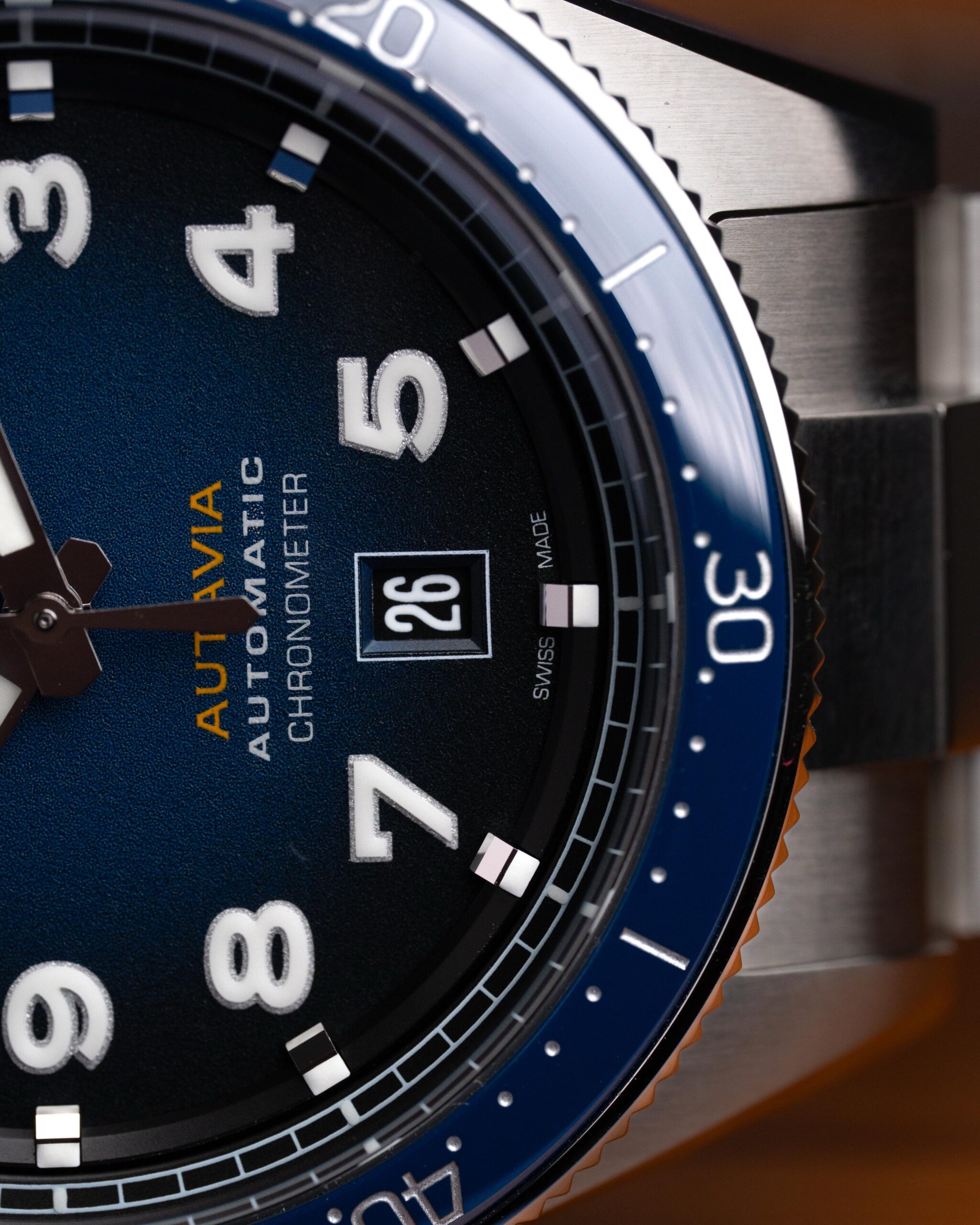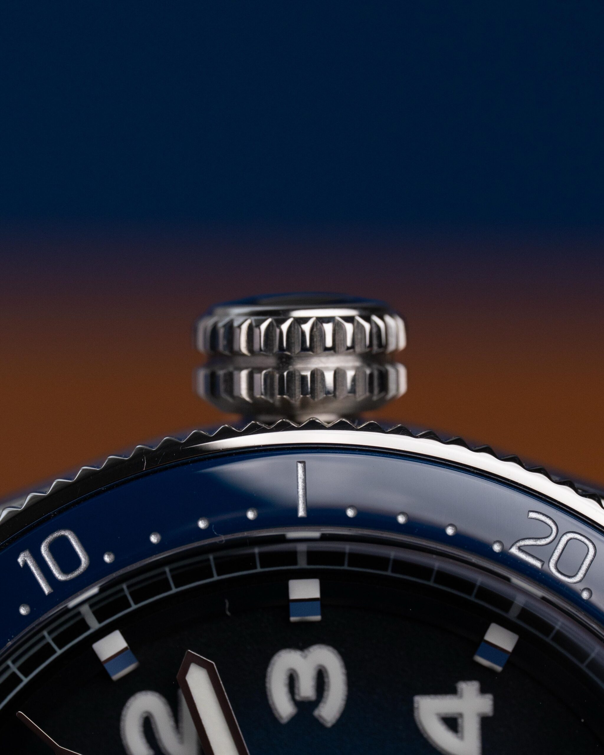 Na tarczy znajdują się luminescencyjne indeksy i wskazówki, które zapewniają doskonałą czytelność w każdych warunkach, a datownik na godzinie 6 dodaje praktyczności. Zegarek chroni odporne na zarysowania szafirowe szkło z powłoką antyrefleksyjną.