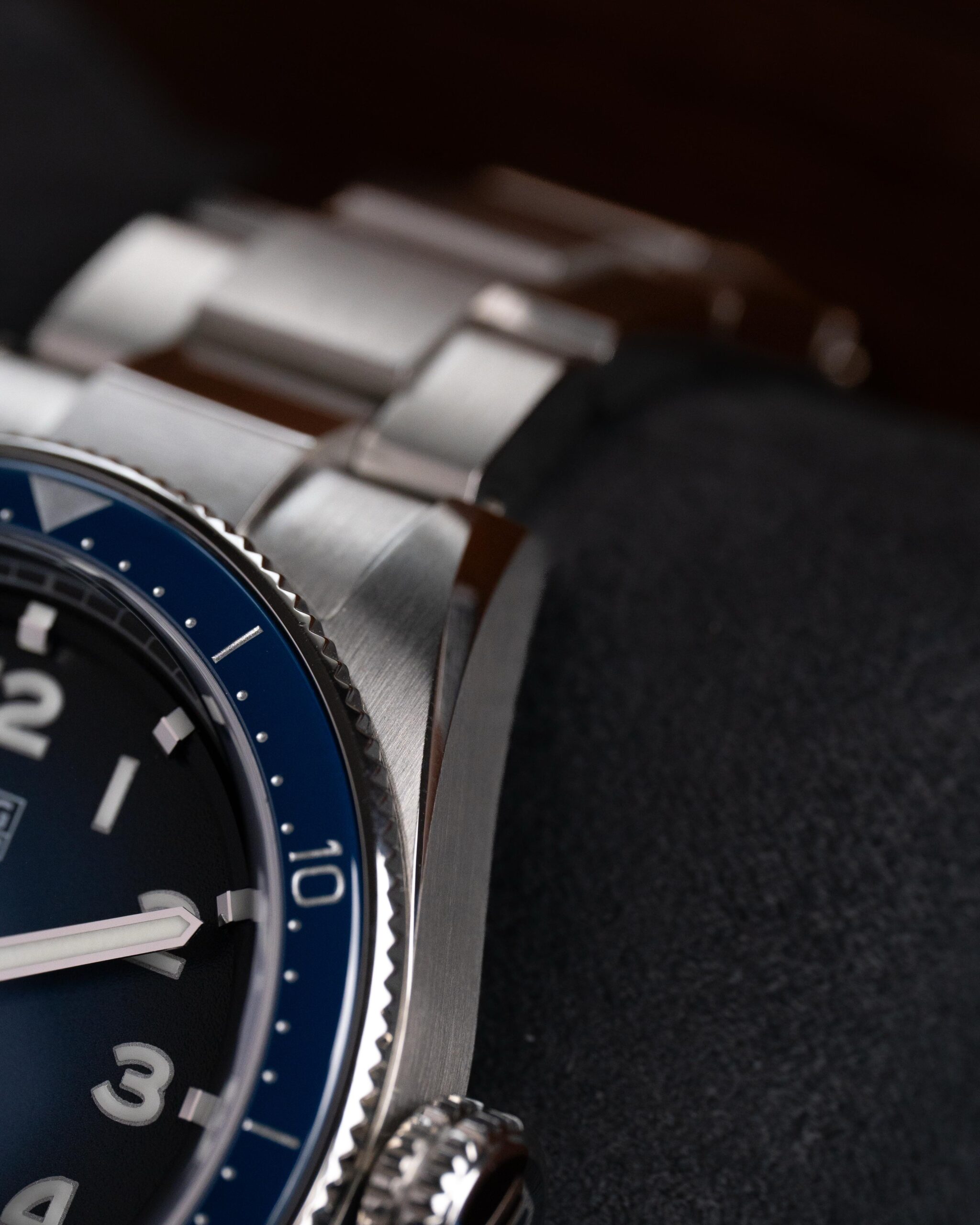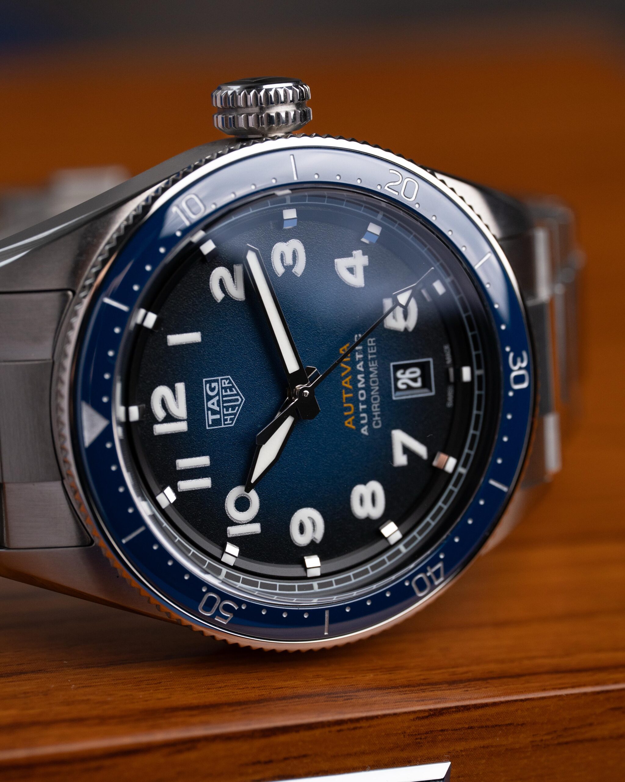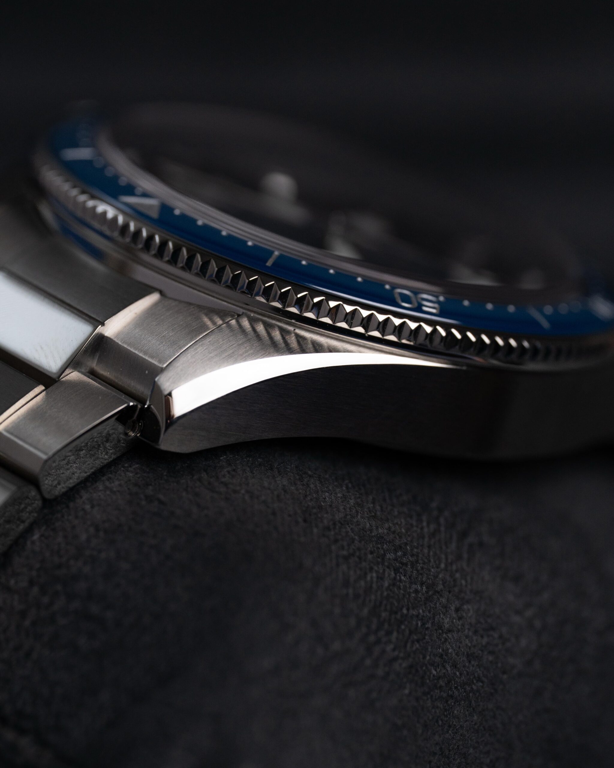 Na tarczy znajdują się luminescencyjne indeksy i wskazówki, które zapewniają doskonałą czytelność w każdych warunkach, a datownik na godzinie 6 dodaje praktyczności. Zegarek chroni odporne na zarysowania szafirowe szkło z powłoką antyrefleksyjną.