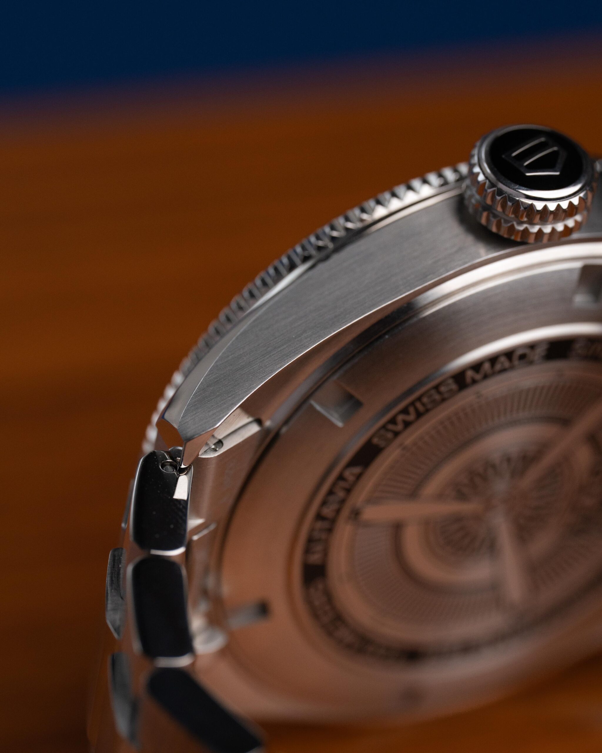 Model wyposażono w stalową bransoletę lub opcjonalnie pasek ze skóry lub kauczuku, który podkreśla sportowy charakter zegarka i zapewnia wygodę noszenia.