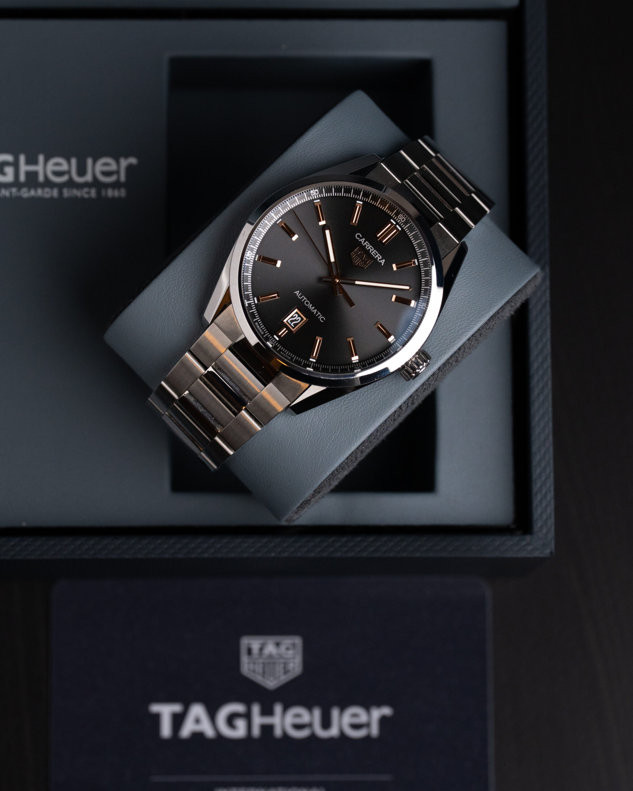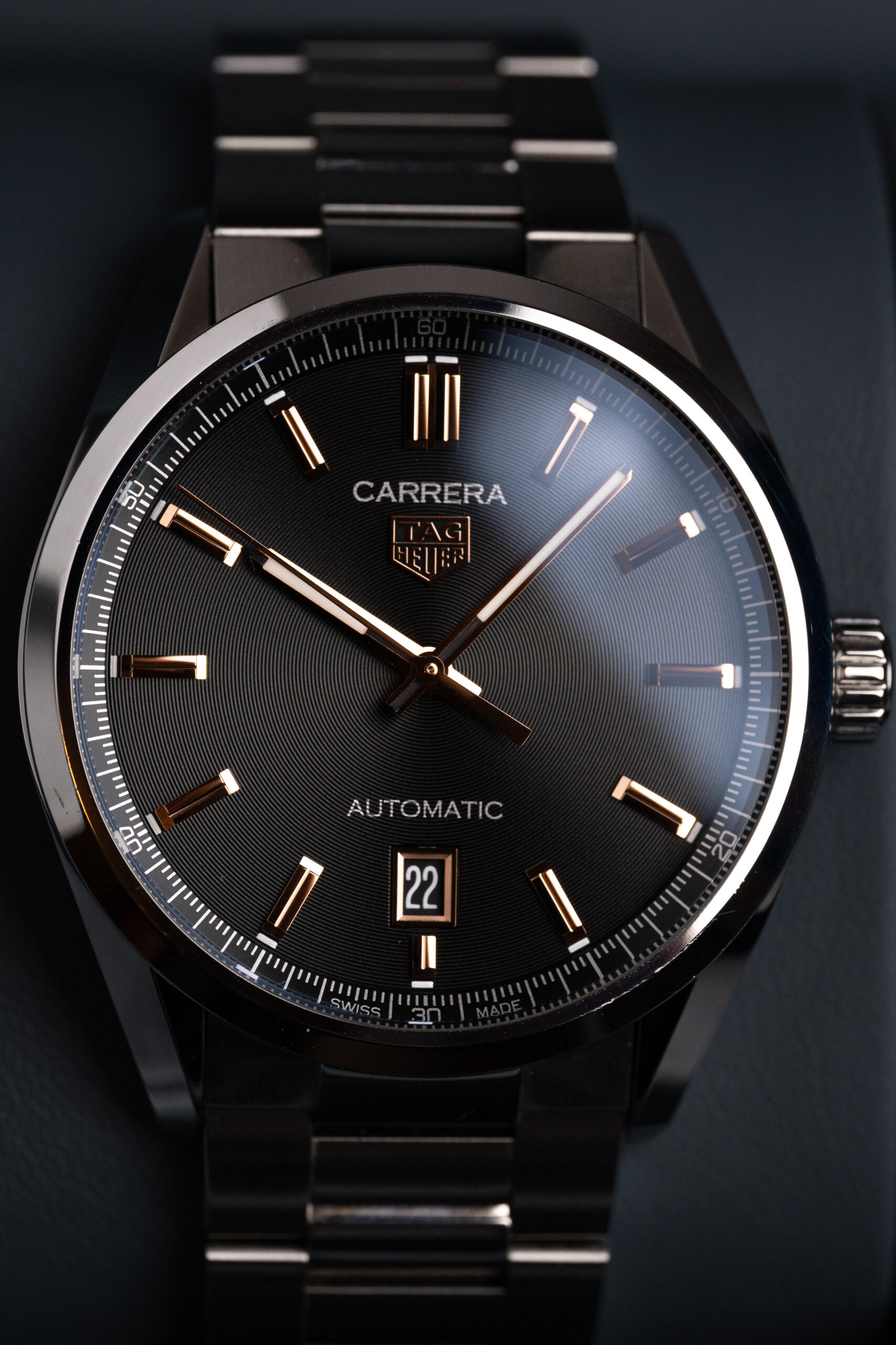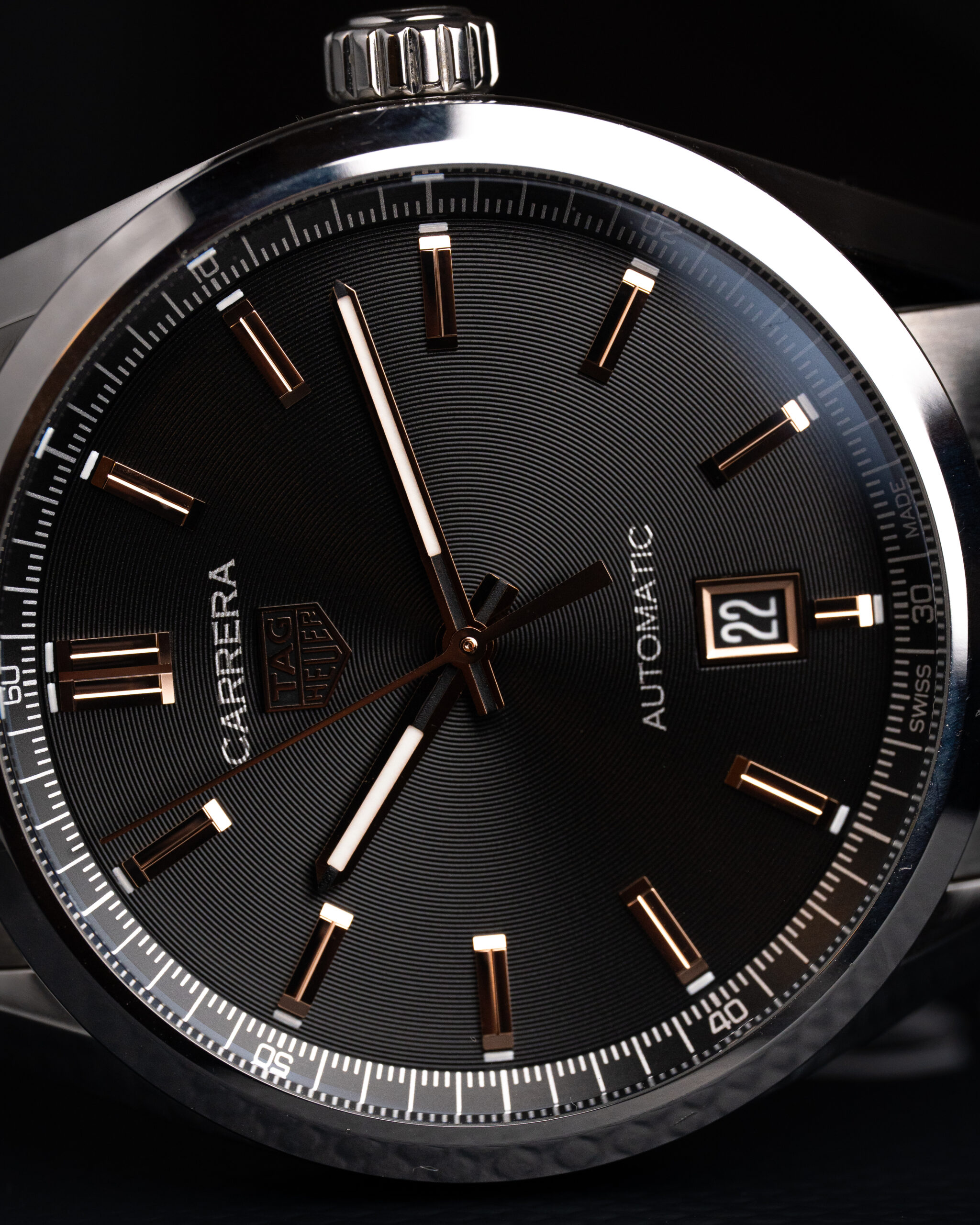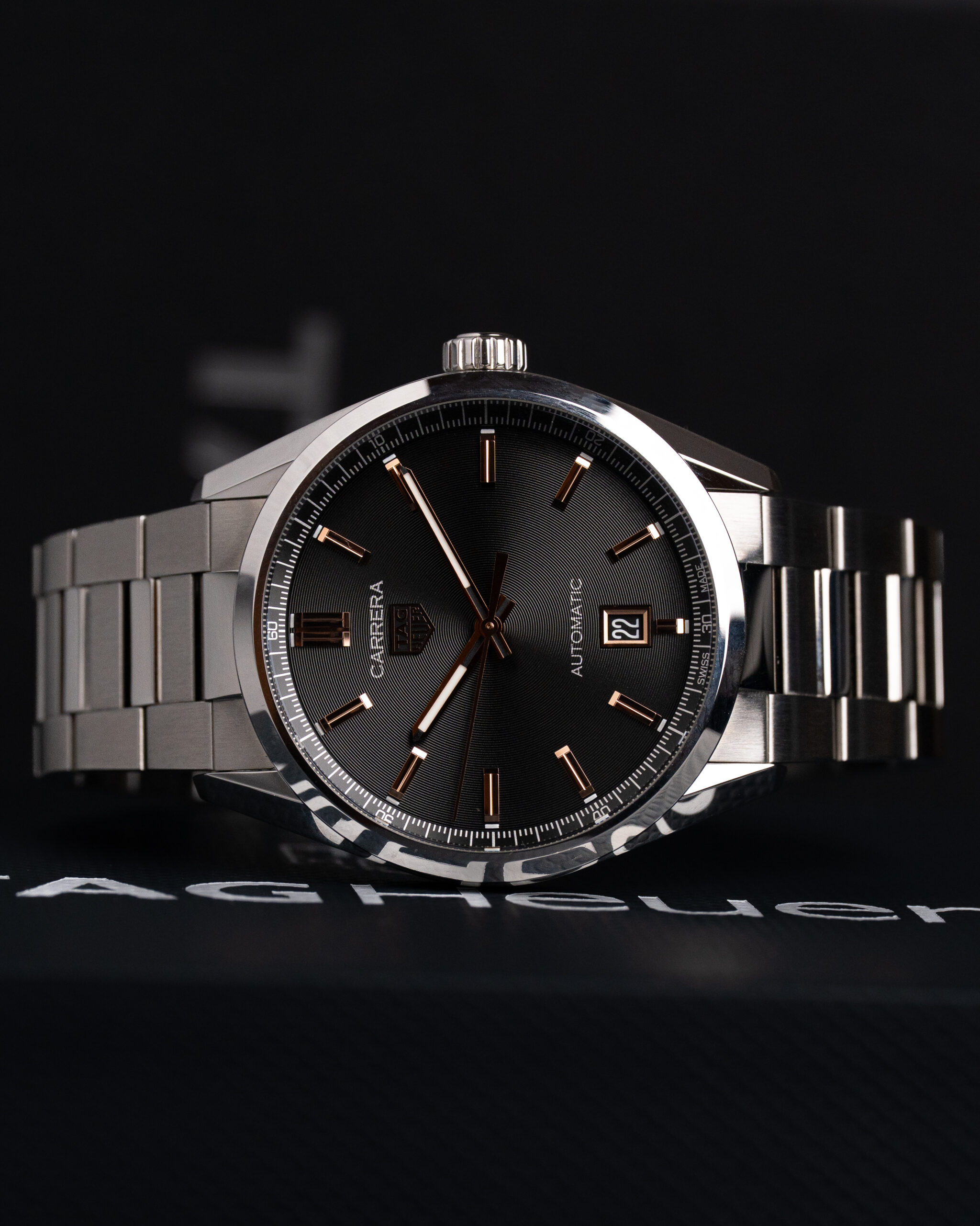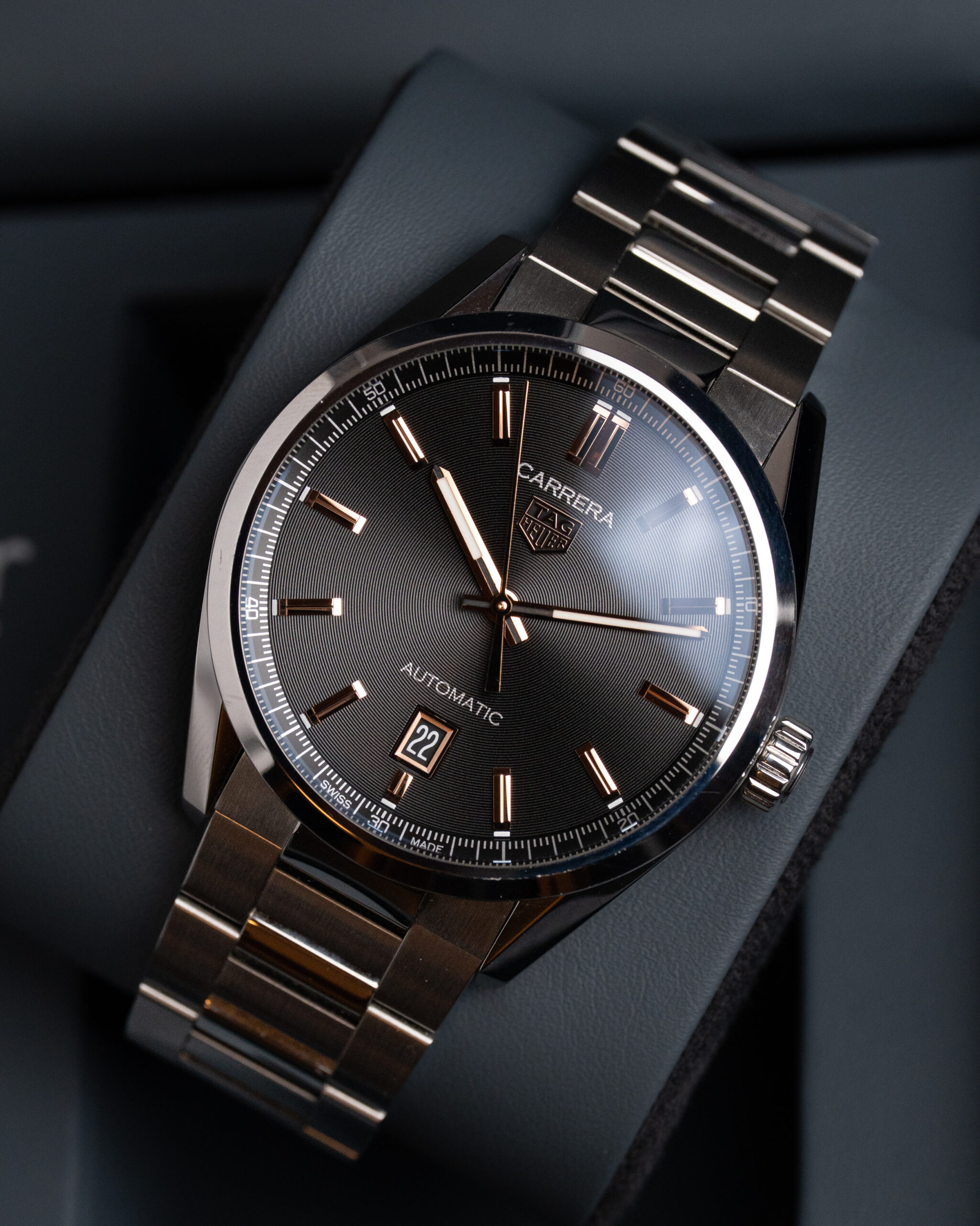 Na szczególną uwagę zasługuje szara tarcza z wykończeniem sunburst, której odcień subtelnie zmienia się w zależności od światła — od chłodnego srebra po głęboki grafit. W połączeniu z polerowanymi indeksami i precyzyjnie wykończonymi wskazówkami tworzy efekt eleganckiego minimalizmu w nowoczesnym wydaniu.