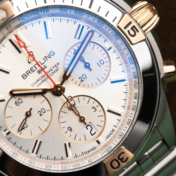 Breitling Chronomat 42 ref. IB0134101G1A to wyrazisty model o sportowo-luksusowym charakterze, w którym techniczna precyzja spotyka się z eleganckimi, złotymi akcentami. Jasna tarcza w połączeniu z detalami w kolorze złota nadaje zegarkowi prestiżowy, a zarazem nowoczesny wygląd. Stalowa koperta o średnicy 42 mm została zestawiona z charakterystycznym obrotowym bezelem z elementami z 18-karatowego złota oraz…