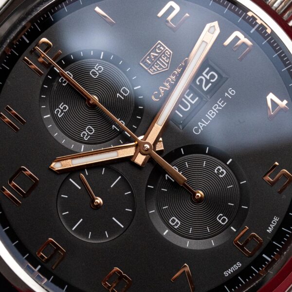 TAG Heuer Carrera ref. CV2A1AB to sportowo-elegancki chronograf łączący wyrafinowany styl z codzienną funkcjonalnością. Model ten nawiązuje do historycznego, wyścigowego dziedzictwa kolekcji Carrera, oferując czytelny układ i dynamiczny charakter idealny zarówno do casualowych, jak i bardziej formalnych stylizacji. Zegarek napędza automatyczny mechanizm Calibre Heuer 02 – wysoko-wydajny mechanizm z kołem kolumnowym i pionowym sprzęgłem, zapewniający…