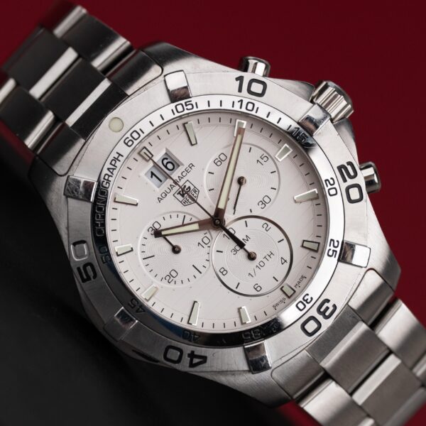 TAG Heuer Aquaracer Chronograph ref. CAF101F.BA0821 to dynamiczny, sportowy zegarek o zdecydowanym charakterze, stworzony z myślą o aktywnych użytkownikach, którzy cenią połączenie precyzji, funkcjonalności i wyrazistego stylu. Należy do linii Aquaracer – kolekcji inspirowanej sportami wodnymi i profesjonalną odpornością na warunki zewnętrzne. Obrotowy, jednokierunkowy bezel, zakręcana koronka oraz wodoszczelność do 300 m (30 bar) świadczą…